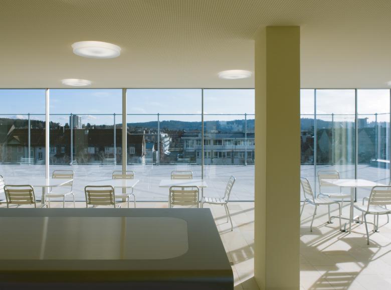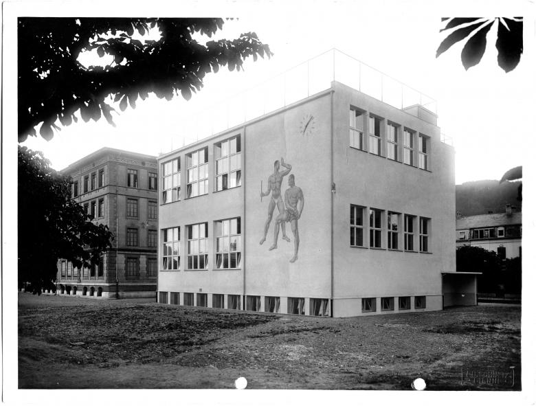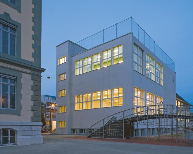 Die Turnhalle im Obergeschoss ist neu als Aula ausgebaut. Der ursprünglich offene Attikaaufbau wird nun als Foyer für die Aula und als Ess- und Theorieraum für den Kochunterricht genutzt. Der Raum ist über die verglaste Südfassade zur grossen Dachterrasse hin erweiterbar. Die neu in dieses Gebäude verlegte Schulküche ermöglicht die einfache Bewirtung in der Aula und im Foyer bei bestimmten Anlässen. Der Übungskeller für die Schwinger im Untergeschoss wurde saniert. Bedingt durch die erhöhte Personenbelegung musste ostseitig ein Treppenhaus als zweiter Fluchtweg angebaut werden. Gestalterischer Leitfaden für alle Eingriffe war die ursprüngliche funktionale und gestalterische Einfachheit des Gebäudes im Sinne der Moderne. Das Farbkonzept basiert auf den Untersuchungen durch einen Restaurator.