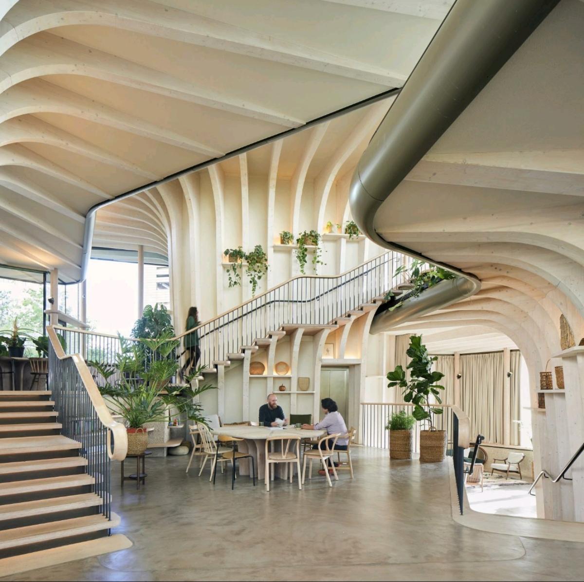 Heatherwick Studio, based in London, was responsible for the design of Maggie’s in Leeds (Yorkshire). Situated in the midst of a complex of hospital buildings, the available land was one of the few green spaces on the grounds. The studio decided to emphasize this aspect and conceptualized the architecture as a plant. On the sloping terrain, Heatherwick Studio designed the building as a group of three structures reminiscent of trees. Embracing Maggie's belief that good design can help people feel better, natural materials and ecological construction techniques were employed. The building structure consists of a prefabricated spruce wood system. Porous materials like lime plaster help maintain humidity inside the naturally ventilated building. The bright interiors with their homely design are inviting people to linger.