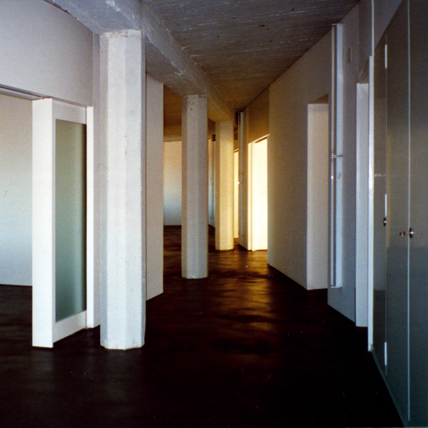 Die grobe, rohe Betondecke mit ihrem zentralen Unterzug wird offengelegt und weiss lasiert. Ihre Oberfläche kontrastiert mit den glatten, weiss gestrichenen Wänden und dem Mattglas der Schiebetüren.