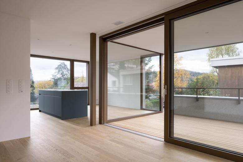 Das lichtdurchflutete Treppenhaus mit Lift befindet sich im Zentrum des Gebäudes und nimmt die verschiedenen Richtungen der Gebäudeteile auf. Es entstehen spannende mehrgeschossige Räume und Sichtbezüge. Die Wohnungen finden ihren räumlichen Abschluss jeweils in einem offenen Wohn-/Essbereich mit anschliessendem gedecktem Sitzplatz. Schlaf- und Nebenräume reihen sich um den Erschliessungsbereich der Wohnungen.