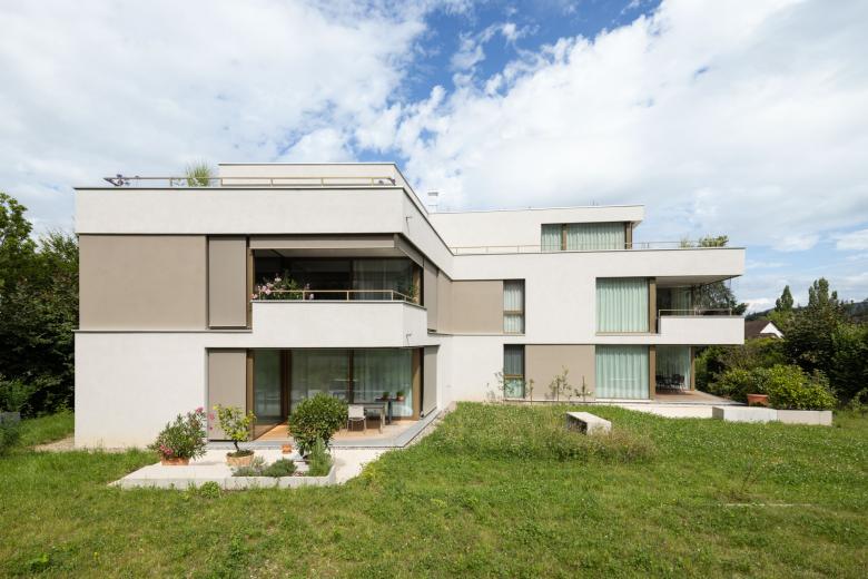 Das Mehrfamilienhaus mit fünf Eigentumswohnungen befindet sich an Hanglage im Ergolztal in einem ruhigen Wohnquartier. Der zweigeschossige Baukörper mit jeweils zurückversetztem Attika- und Sockelgeschoss ist durch die L-Form mit zwei schräg weglaufenden Seiten und einen Versatz im Volumen gegliedert. Das Haus hat eine angemessene Massstäblichkeit und integriert sich vorbildlich in die eher kleinteilige Umgebung.