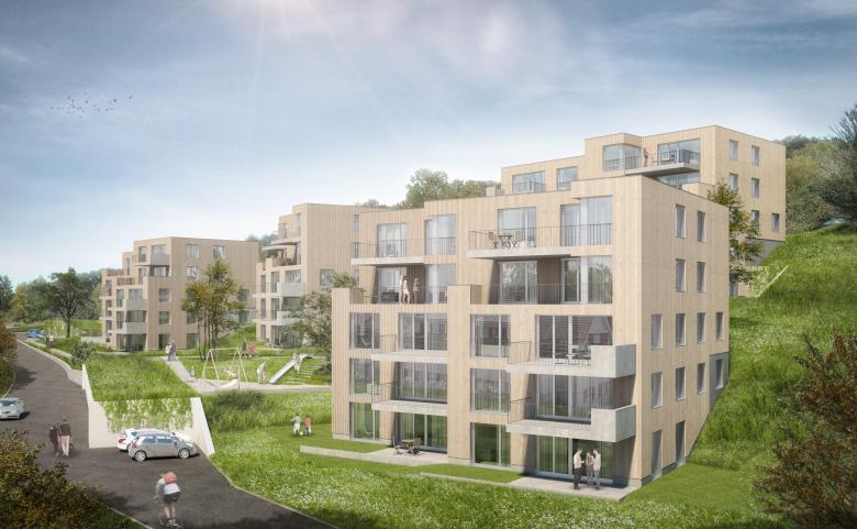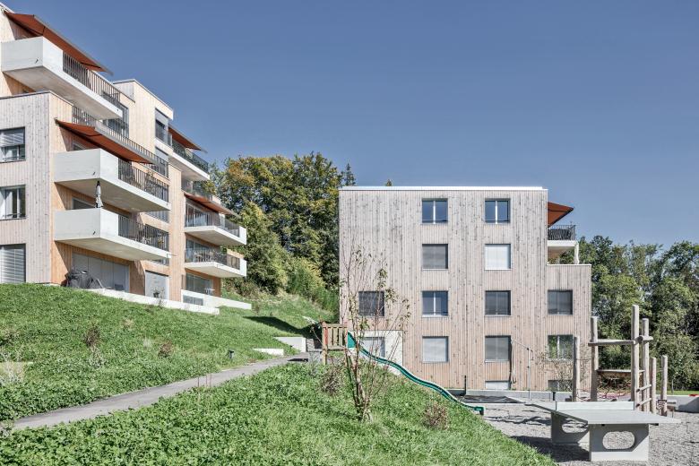 Die Mehrfamilienhäuser liegen eingebettet in die Landschaft von Meilen Richtung Pfannenstiel mit Rundsicht auf das darunterliegende Siedlungsgebiet. Das trapezförmige, steil abfallende Grundstück bietet einen panoramischen Blick auf den Zürichsee im Süden, während im Osten ein ruhiger Wald und ein Bachtobel an das Gelände grenzen. Die Planung umfasst vier Wohneinheiten mit zusammen 39 Familienwohnungen, von denen drei entlang des Rückens der Pfannenstilstrasse positioniert sind, wodurch sie sich harmonisch in das bestehende Straßenbild einfügen. Über einen Gehweg entlang der Höhenlinien wird das vierte der Gebäude und der Spielplatz bequem und rollstuhlgerecht erreicht. Die vierte Einheit befindet sich im südlichen Teil des Grundstücks und bietet ein ruhiges, privates Refugium zum Wald und zum Bachtobel.