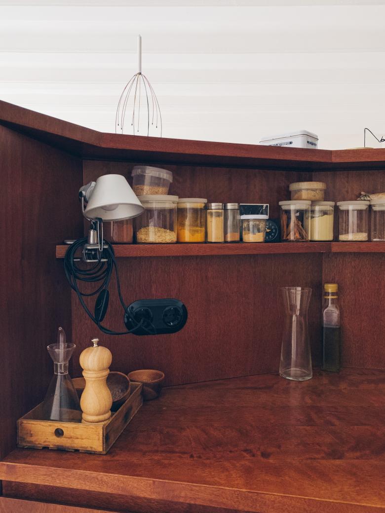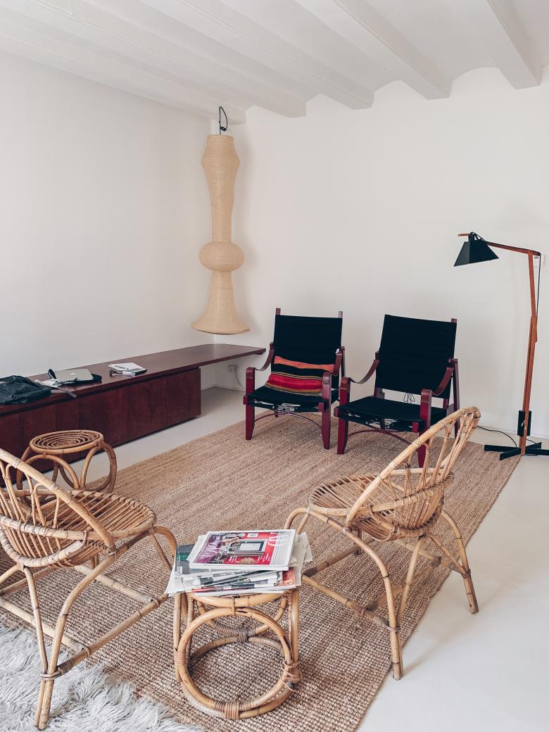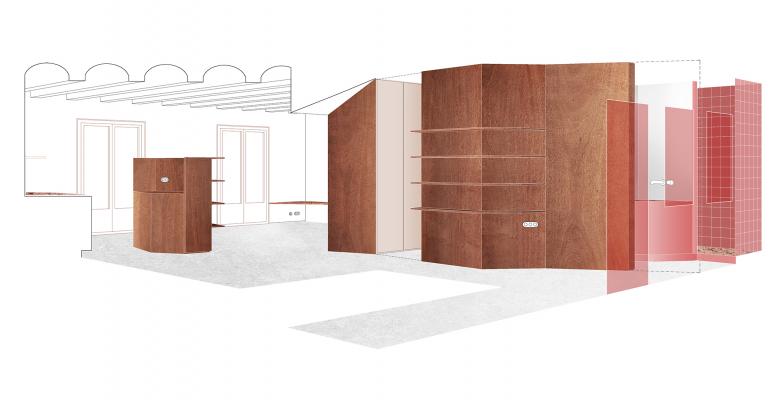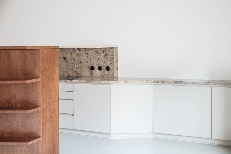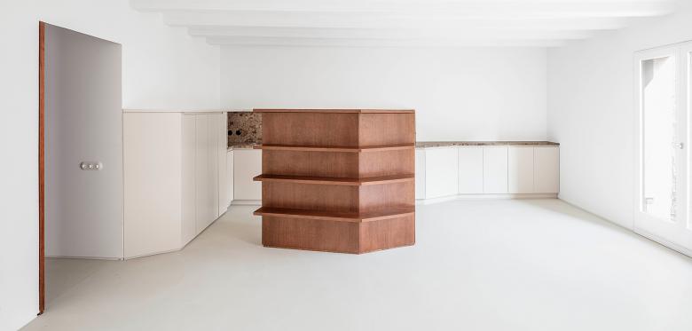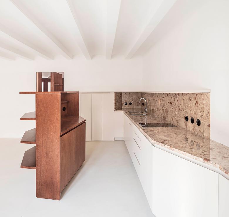 El interior se concibe como un lienzo neutro y luminoso definido por patios y un muro de carga central. Dentro de este vacío, una serie de “(in)muebles” diseñados a medida —elementos fijos de formas sinuosas— organizan el programa, definen las estancias y generan recorridos circulares. La combinación de tonos crema, mármol rosa, cedro teñido y acero inoxidable activa el espacio manteniendo una atmósfera fluida y adaptable.