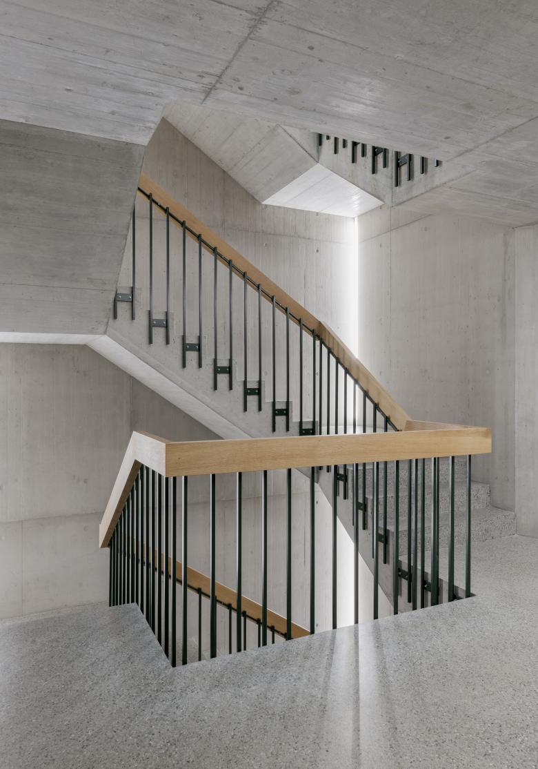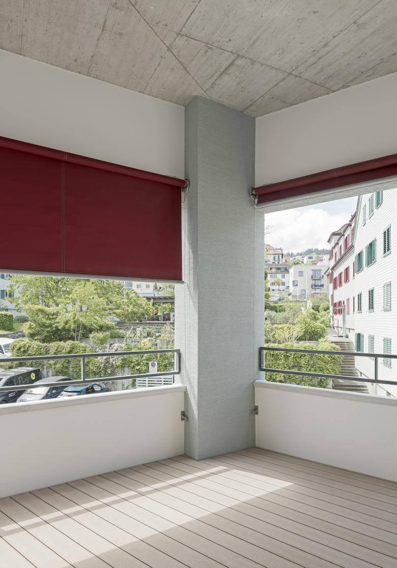 Die privaten Aussenräume befinden sich immer an den Hausecken und richten sich gegen den Hof. Sie sind als zusätzliches Zimmer entworfen und obwohl es Loggien sind, die eine hohe Privatsphäre garantieren, wirken sie dank ihrer Ecklage offen und werden gut besonnt.