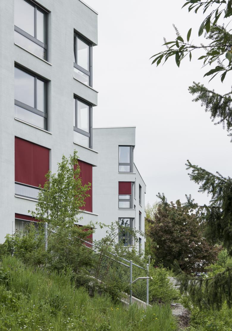 Wie bei einer Kette reihen sich einzelne Steine zu einem Ganzen aneinander und fassen einen grünen und öffentlichen Hof. Die neuen Häuser sind untereinander nahezu identisch. Durch Spiegelung und Verdrehung der Gebäude entstehen unterschiedliche Zwischenräume, welche Ausblicke und nachbarschaftliche Beziehungen ermöglichen. Durch das Knicken der einzelnen Gebäude erhält man eine längere Fassadenabwicklung und erreicht eine bessere Ausrichtung der Wohnungen. Jedes Haus erhält mehr als nur ein Gegenüber und wird Teil einer Gemeinschaft. Durch die Staffelungen und das Abwinkeln der Körper passen sich die Gebäude in die Massstäblichkeit der Umgebung ein. Das Areal erhält neu je eine Adresse von oben und vom See her. Die Häuser betritt man vom Hof aus, je nach Lage im Erd- oder im Gartengeschoss. Die Gebäude sind entlang dem Hang abgestuft und ein leicht fallendes Dach bindet die Häuser zusammen. Die Höhe der unteren beiden Häuser ermöglicht weiterhin den Blick auf den Pfannenstil und den See.