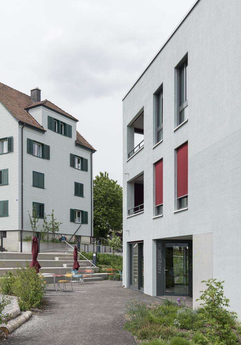 Die heutige Überbauung der Genossenschaft Horgen ist geprägt vom gemeinsamen mittigen Aussenraum und den vielen kleinen und gewachsenen Orten rund um die Gebäude. Die Wohnhäuser gehören durch ihre Materialisierung, Architektur und Stellung zusammen und vermitteln ein Gefühl der Gemeinschaft.
