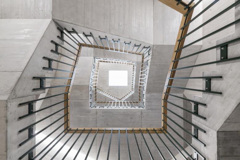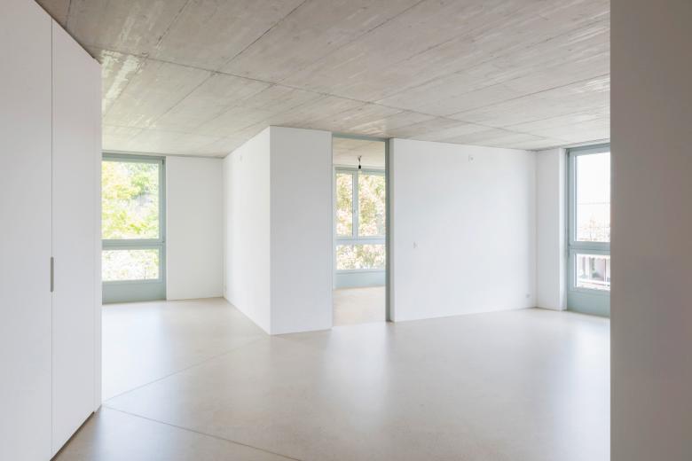 Durch den Gebäudeknick erhalten sie unabhängig von ihrer Ausrichtung viel Licht. Alle Wohnungen verfügen über einen offenen, grossen Raum, der zoniert ist in Wohnraum, Wohnküche und Eingang. Die diagonalen Sichtbezüge erzeugen ein grosszügiges Raumgefühl und erlauben den Ausblick in verschiedene Himmelsrichtungen.