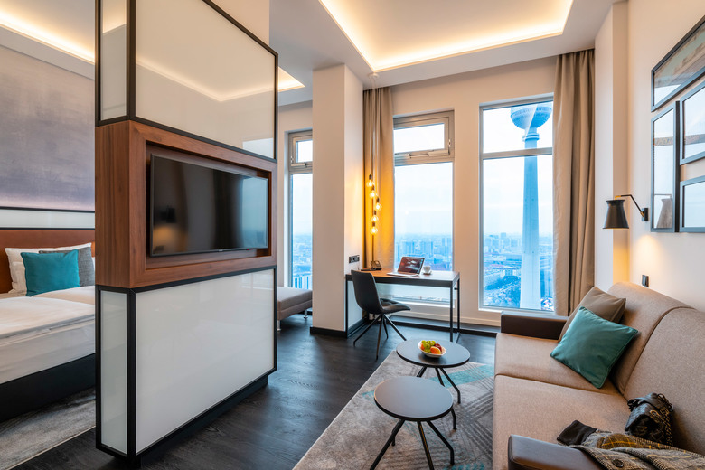 Über den Dächern von Berlin: Die Umnutzung der ehemaligen Eventfläche im 37. Stock im Park Inn in exklusive Suiten mit einem einzigartigen Blick auf die Hauptstadt war die Grundlage für das neue Konzept – ein Spiel aus leichten, hellen Farbtönen in Kombination mit einer filigranen Linienführung bildete die Antwort. Ein Hauch von Bauhausarchitektur lebt auf. Sonst nimmt sich die Innenarchitektur eher zurück, wird mit Respekt vor der beeindruckenden Kulisse nur ‚eingestellt‘ und lässt die Bühne frei für den Hauptdarsteller: Den Blick. Hier ist man der Stadt ganz nah – und doch dem Trubel und dem geschäftigen Treiben so fern.