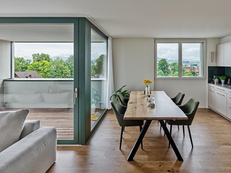 Die erste Phase der Überbauung auf dem Areal der ehemaligen Schreinerei Rüttimann im Ortsteil Siebnen der Gemeinde Galgenen betrifft das Baufeld C, auf dem ein Neubau entsteht. Das Planungsgebiet grenzt im Norden an die stark befahrene Zürcherstrasse an und im Osten an die erhaltenswerte Fassade der Möbelfabrik. Ausgangslage ist der Gestaltungsplan „Rüttimann-Areal Süd“ von lilin architekten. Analog zur Entwicklung und Transformation des im ISOS erwähnten Areals folgt das projektierte Gebäude dem Prinzip der additiven Zusammensetzung von Volumen. Das Ensemble besteht aus vier rechteckigen Gebäuden unterschiedlicher Höhe, jeweils mit drei, vier, oder fünf Vollgeschossen, die versetzt aneinander gereiht werden. Zusätzlich ergänzen eingeschossige Bauvolumen das Ensemble. Geplant ist eine Gewerbenutzung im Erdgeschoss, Wohnnutzung in den Obergeschossen, sowie zwei Untergeschosse mit Einstellhalle, Neben- und Technikräumen. Der Freiraum unterteilt sich in zwei Bereiche: einerseits den Strassenraum, der an die Kantonsstrasse grenzt und welcher mit hartem Belag ausgestattet wird, und andererseits einen Grünraum im Süden, welcher mit Bäumen, Sträuchern, Blumenrasen, Spielwiese und einem Spielplatz als Erholungs- und Begegnungsort für die Bewohner der Siedlung ausgestattet wird.