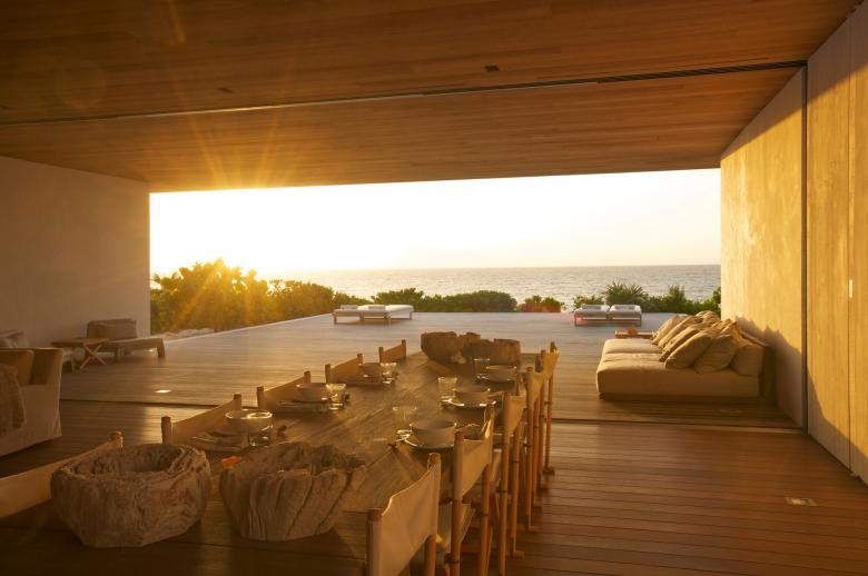 Aufgrund der Überlegungen zu Sturmfluten und dem Anstieg des Meeresspiegels haben wir das Haus 10 Meter (33 Fuß) über dem Meeresspiegel auf einer Sanddüne errichtet. Das große Schindeldach schützt eine interne „Veranda“, die sich durch das Zentrum des Hauses zieht – im Grunde ein offener Durchgang für frische Luft. Vom Land aus führen Treppen aus dem Dschungelboden zu diesem Hauptwohnraum, der einen spektakulären Blick auf das Meer eröffnet und die Menschen durch das Haus bis zur Düne und darüber hinaus zum Ozean führt.