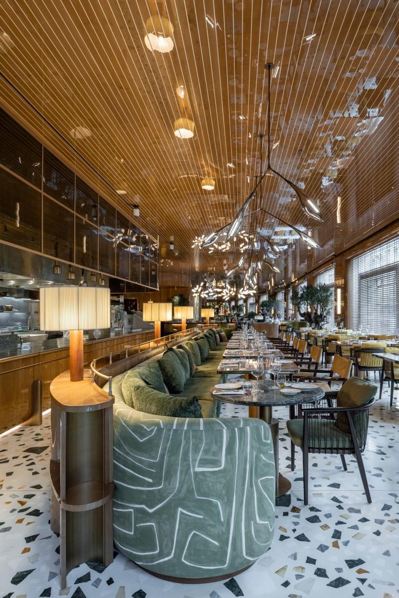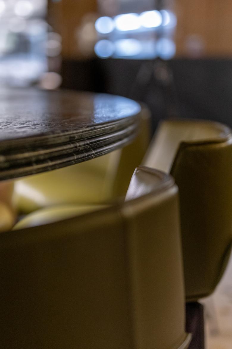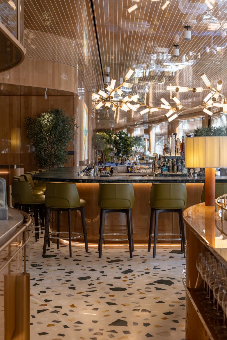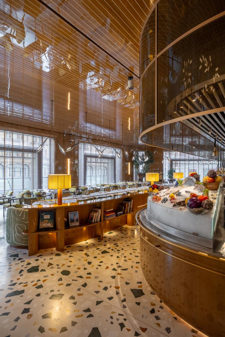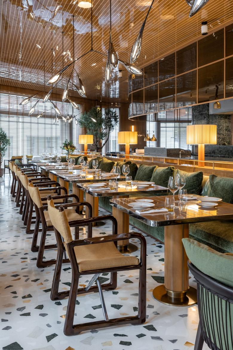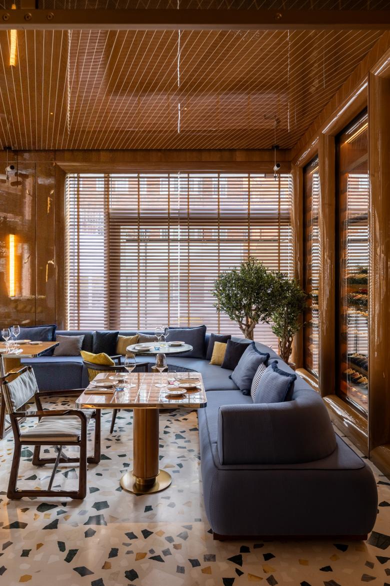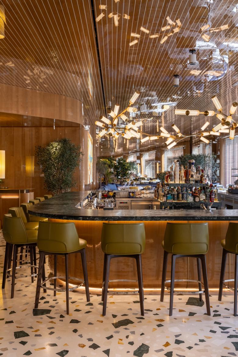 The architects and designers drew inspiration from the sea, creating a flowing spatial design and selecting natural textures that evoke the atmosphere of a private yacht voyage along the Apennine Peninsula. The bar, shaped like a yacht, takes center stage, with ceiling and table finishes echoing the texture of a yacht’s deck. Verde Alpi stone—evoking the lush landscapes of Capri—serves as a signature material, while delicate lighting elements inspired by floral trees add a whimsical touch. Vibrant textiles and nautical-inspired details in the fabrics and leather tie everything back to the overarching Mediterranean theme.