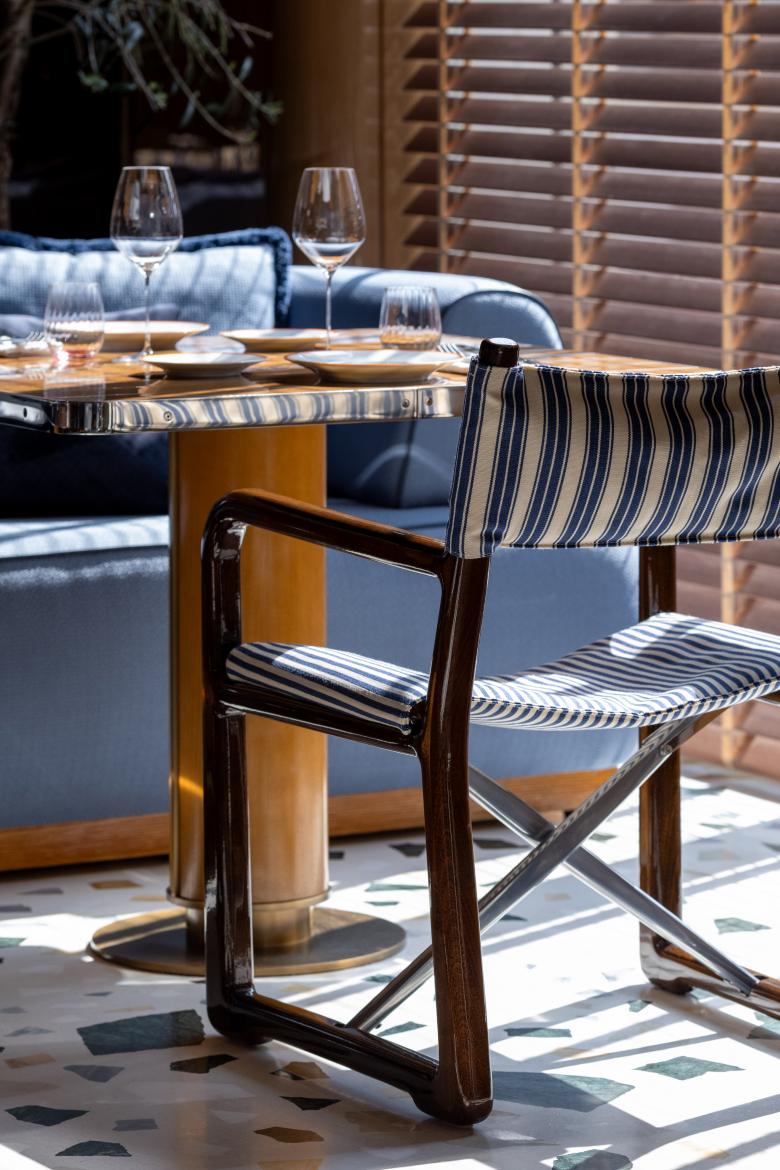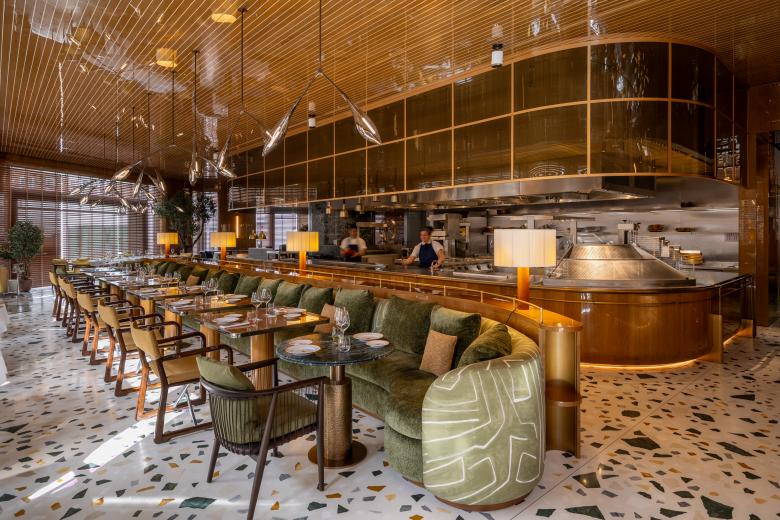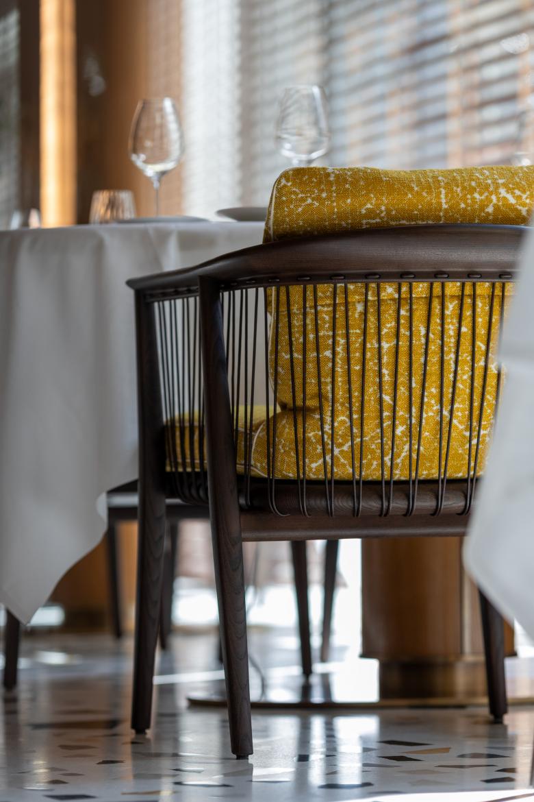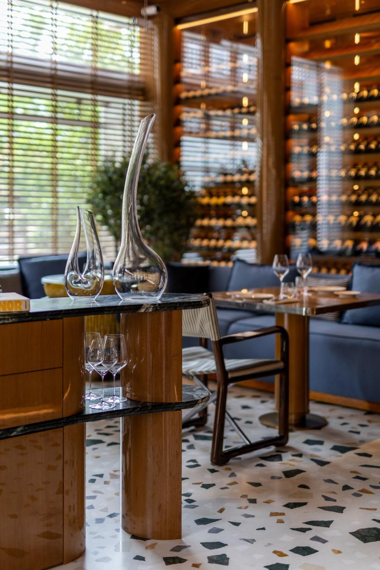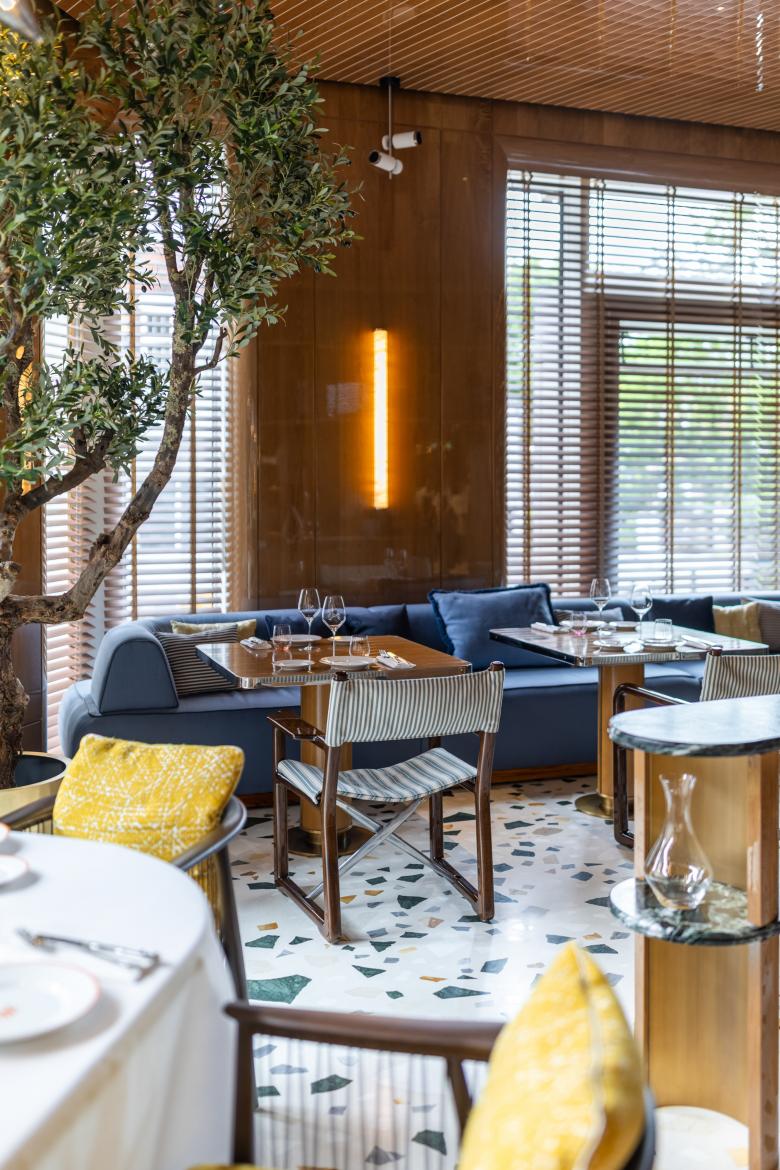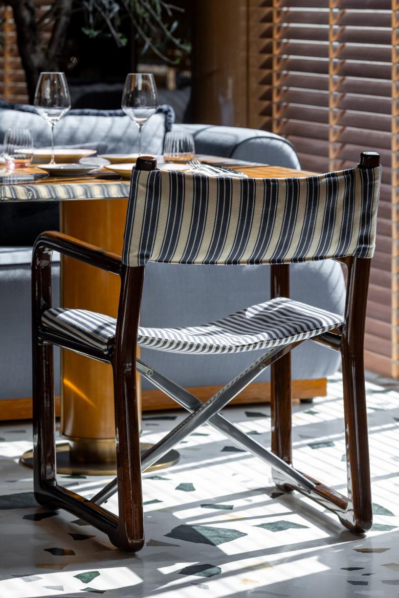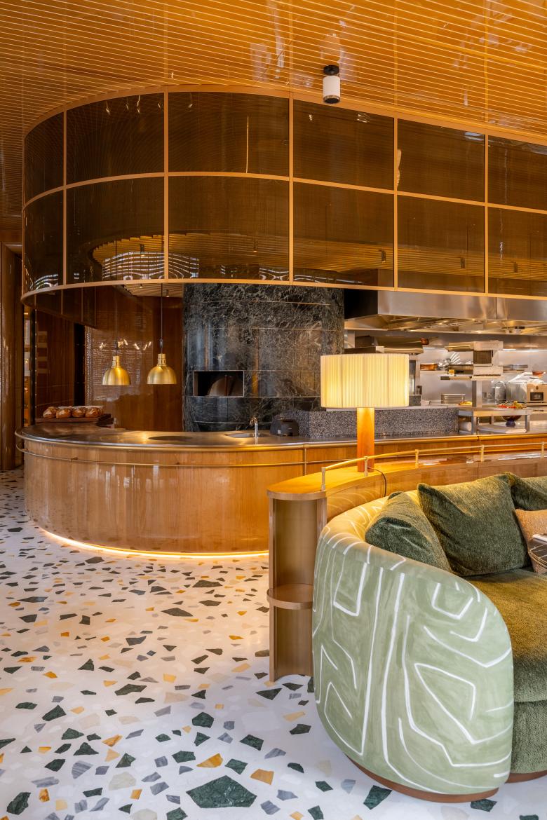 The architects and designers drew inspiration from the sea, creating a flowing spatial design and selecting natural textures that evoke the atmosphere of a private yacht voyage along the Apennine Peninsula. The bar, shaped like a yacht, takes center stage, with ceiling and table finishes echoing the texture of a yacht’s deck. Verde Alpi stone—evoking the lush landscapes of Capri—serves as a signature material, while delicate lighting elements inspired by floral trees add a whimsical touch. Vibrant textiles and nautical-inspired details in the fabrics and leather tie everything back to the overarching Mediterranean theme.