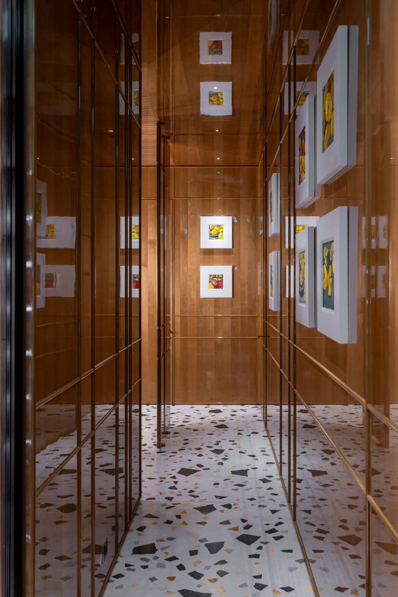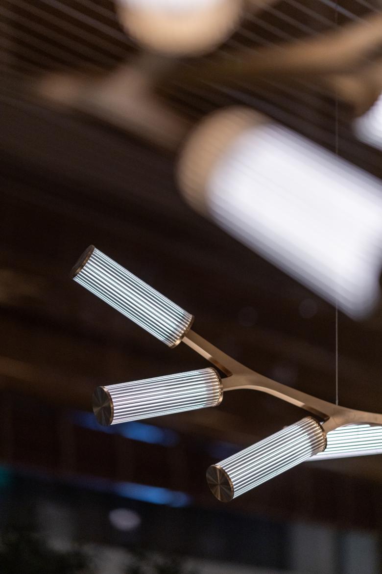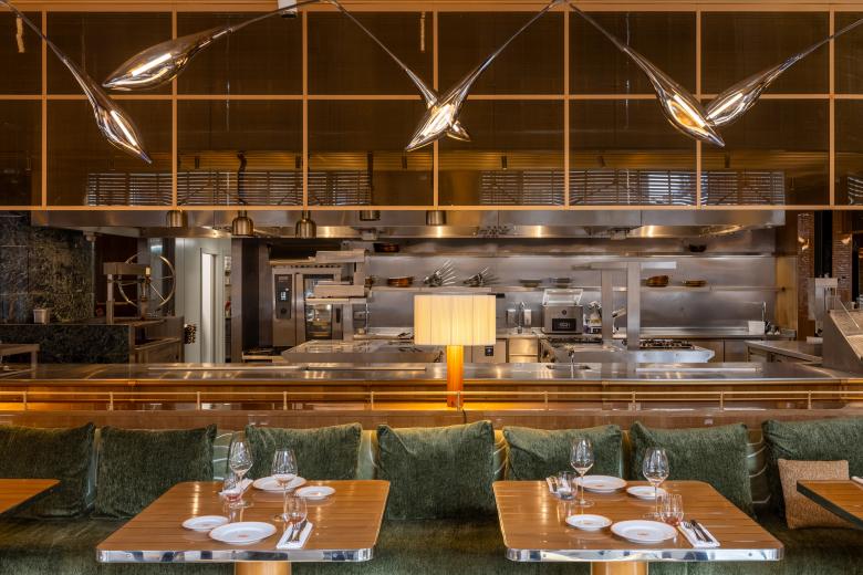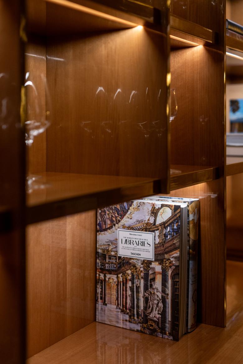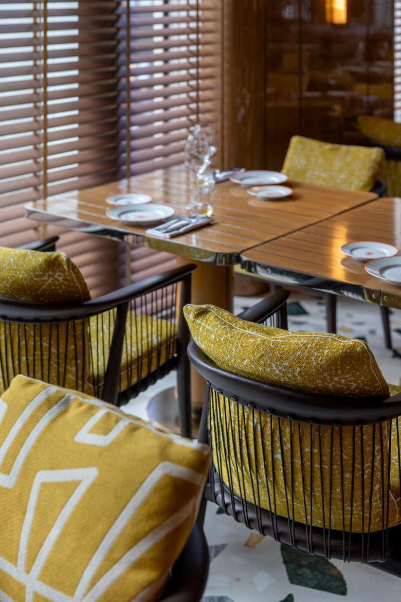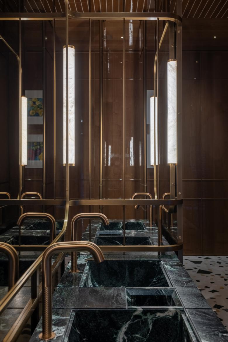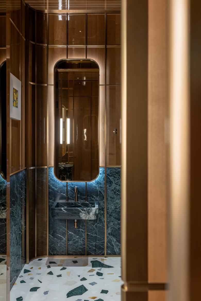 The architects and designers drew inspiration from the sea, creating a flowing spatial design and selecting natural textures that evoke the atmosphere of a private yacht voyage along the Apennine Peninsula. The bar, shaped like a yacht, takes center stage, with ceiling and table finishes echoing the texture of a yacht’s deck. Verde Alpi stone—evoking the lush landscapes of Capri—serves as a signature material, while delicate lighting elements inspired by floral trees add a whimsical touch. Vibrant textiles and nautical-inspired details in the fabrics and leather tie everything back to the overarching Mediterranean theme.
