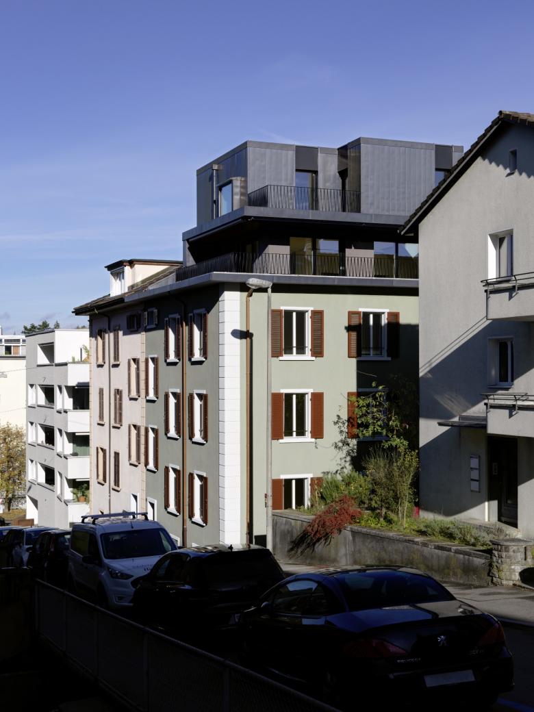 Ein charmantes Stadthaus wird, nebst einer Kernsanierung, mit einer zeitgemässen Aufstockung erweitert. Anstelle der früheren Vierzimmerwohnungen sind, jeweils auf einer Etage, neu zwei kleine Studiowohnungen organisiert. Der historische Charme des Gebäudes konnte weitgehend erhalten bleiben, obwohl die Qualität bezüglich Akustik und Haustechnik an die heute gültigen Anforderungen angepasst wurden. Das Haus ist heute mit einer Luft-Wasser Wärmepumpe ausgerüstet, welche mit einer Photovoltaikanlage betrieben wird. Der als Holzbau konzipierte Dachaufbau, ersetzt den alten Dachstock und fügt sich mit seiner klaren Volumetrie geschickt in die Dachlandschaft der Blockrandbebauung ein. Das Farb- und Materialkonzept lehnt sich an die Farbtöne des Altbaus an und erhält mit dem in braunem Kupfer gehaltenen Dachaufbau einen selbstbewussten Auftritt.