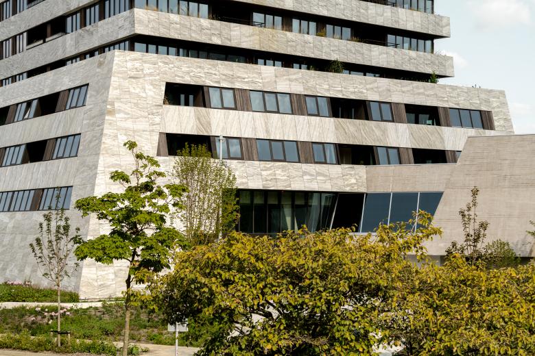 The residential tower offers 210 high-end rental and owner-occupied apartments over 32 floors. These combine spacious floorplans with huge windows framing extraordinary views, luxurious natural materials, and loggias and balconies. Up to the 18th floor, DELVA added greenery into the integrated planters of the balconies, connecting to the Bunker Park.