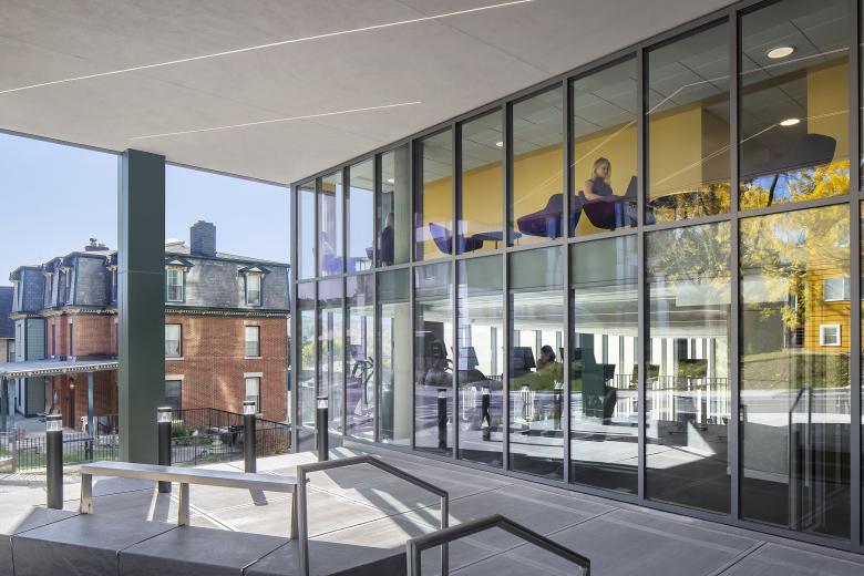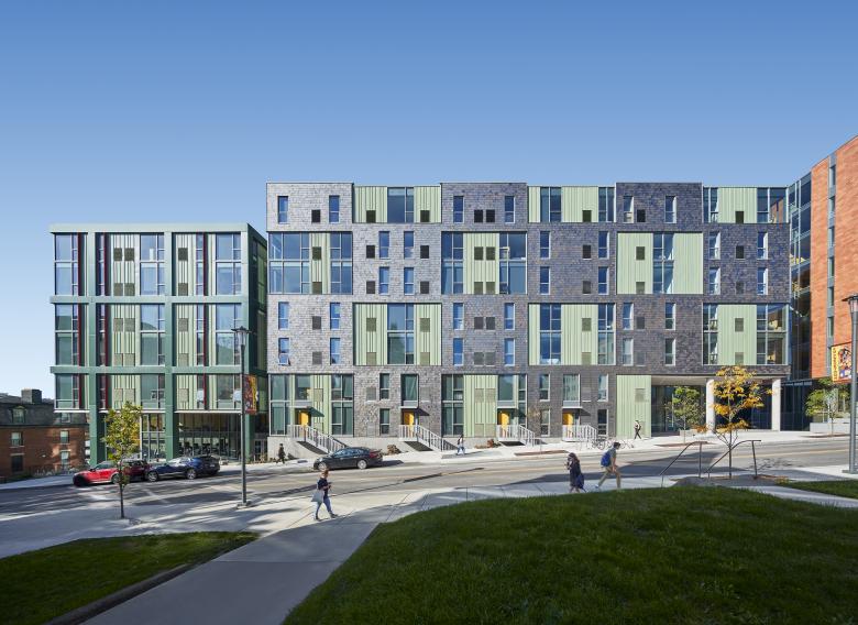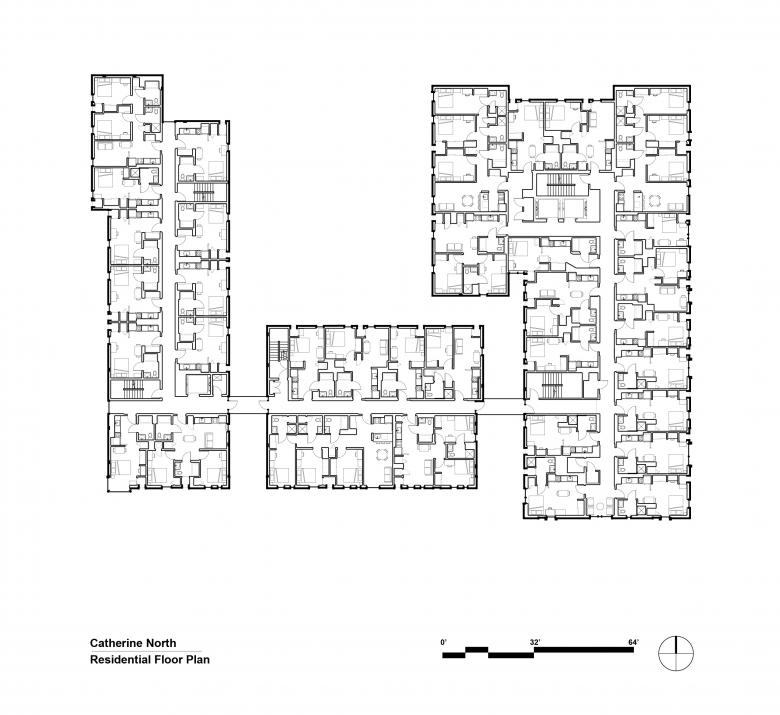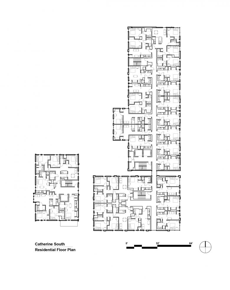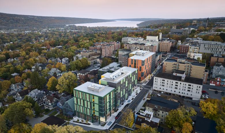 Catherine Commons is an apartment-style residential community for the Cornell University off-campus student population in the Collegetown district of Ithaca, New York. The project consists of six residential buildings located on two adjacent sites: Catherine North and Catherine South. Prominently lining the main artery of College Avenue and gracefully stepping down in height towards residential neighborhoods and the City of Ithaca, Catherine Commons includes studio, 1-, 2-, and 3-bedroom apartments, all with private bedrooms and bathrooms and access to retail and recreational amenities including a fitness center and indoor and outdoor community courtyards. The buildings set themselves apart from other large-scale student housing in the vicinity, with many of the ground floor corners open to the street to provide double-height public gathering spaces that promote social interaction with the community. Furnished with informal seating that is nearly always in use, these entranceways are monumental yet feel comfortable on a human scale.