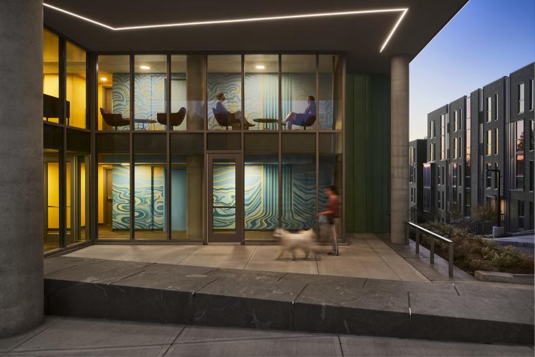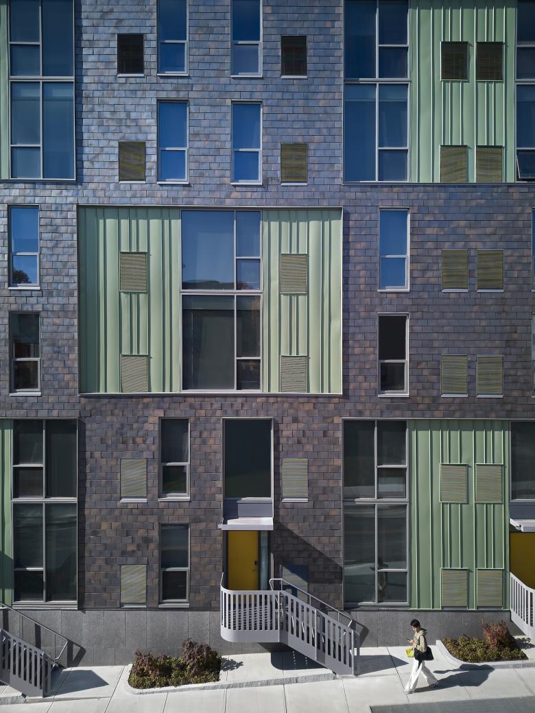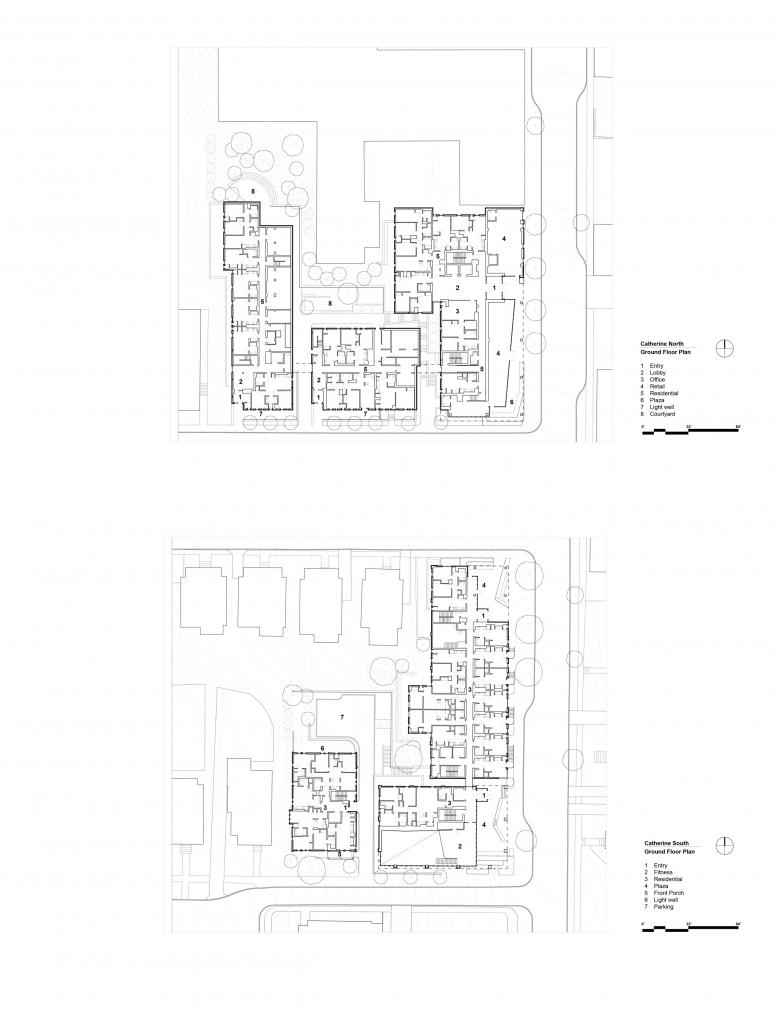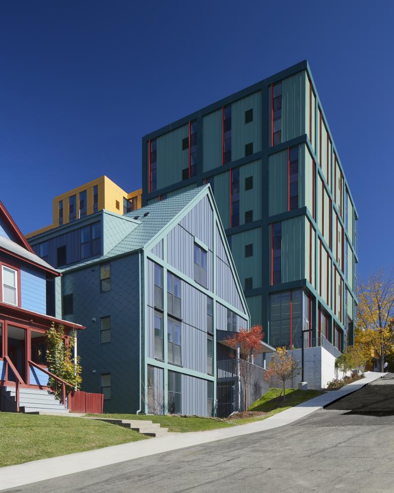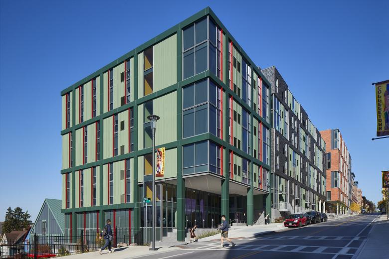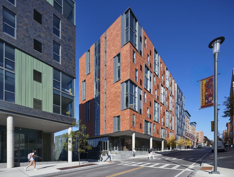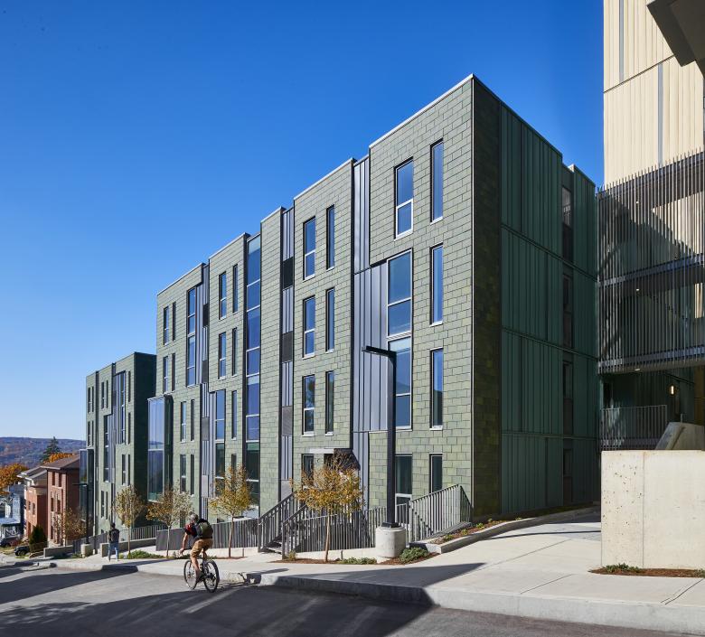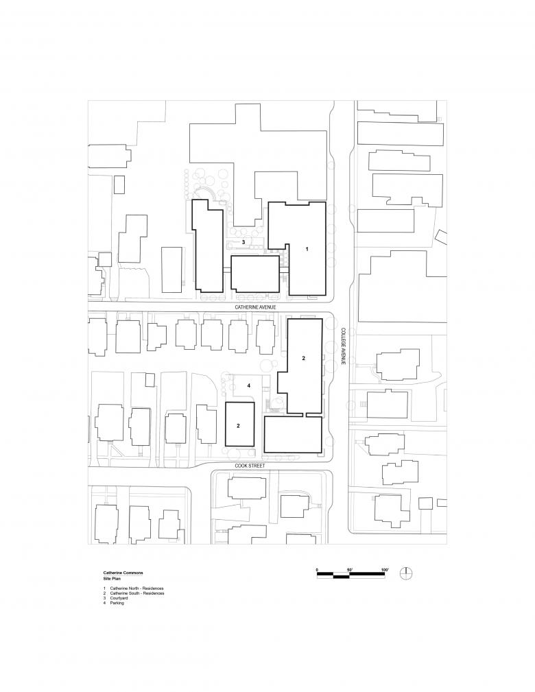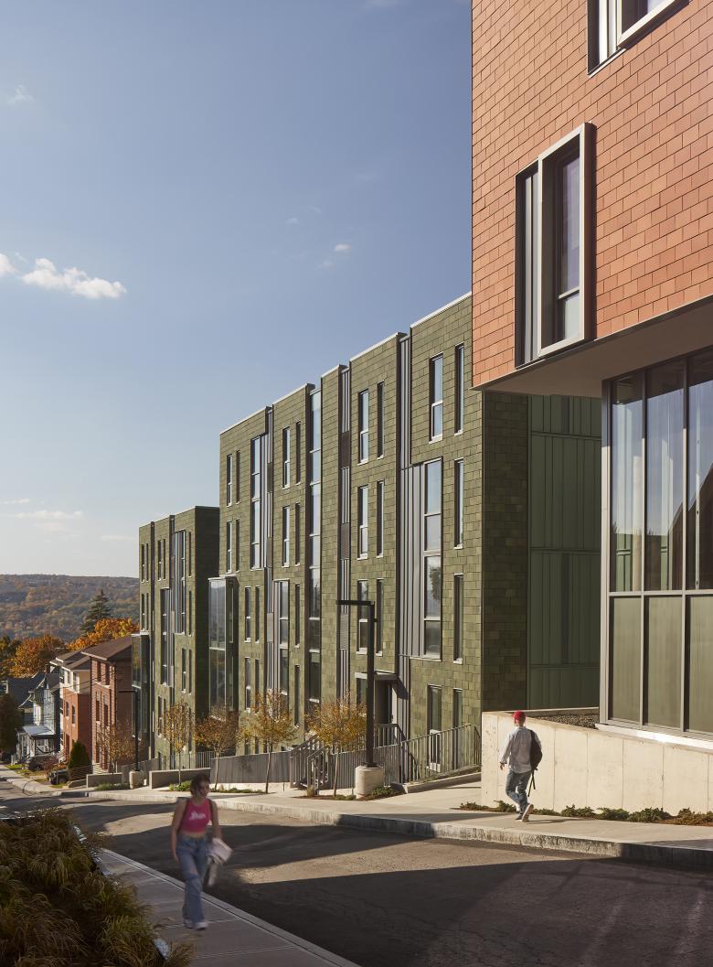 Catherine North encompasses three buildings connected via an open metal pedestrian bridge. An eight-story structure provides commercial spaces on the first floor and multi-family residential units above, while the other two buildings, both four stories, are designated solely for residential use. At ground level, openings between these buildings promote physical and visual connections to an interior courtyard. At Catherine South, three buildings step down in height as grade falls along College Avenue and Cook Street. Two buildings comprise seven stories of multi-family residential units with a ground level fitness center. The other building is residential in form and scale, with a pitched roof, shingles, smaller-scaled windows and dormers, and a projected front porch. This three-story building is set back from the street to align with neighboring houses and to complement the Collegetown vernacular. All six buildings include a playful mix of window sizes and incorporate colorful, high-quality materials such as vertical metal panels with protruding fins, and terracotta bricks in unique, eye-catching patterns.