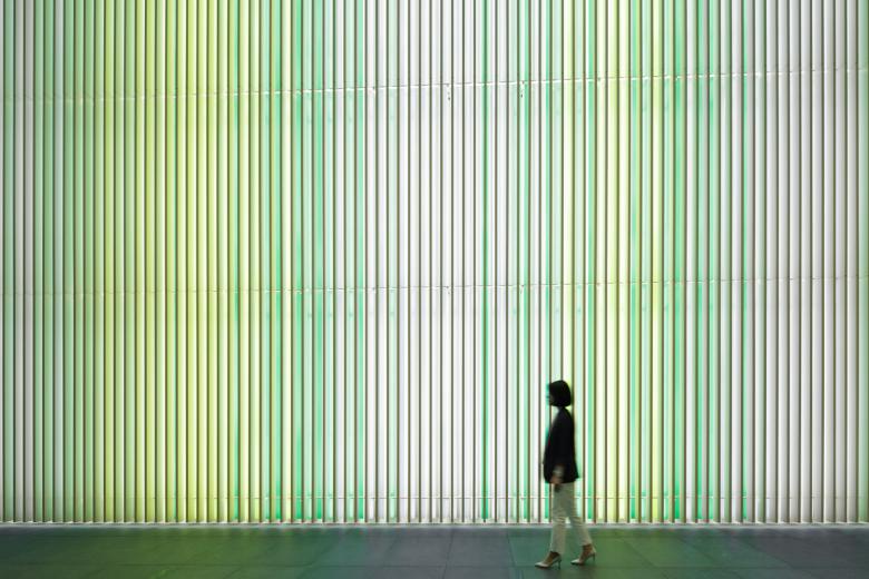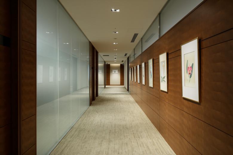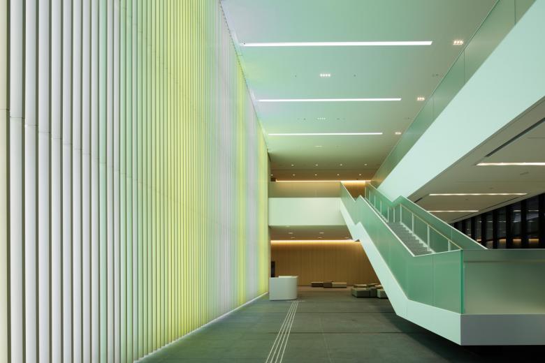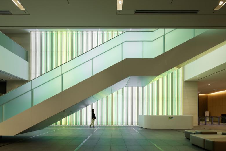 新本社の顔となるエントランスでは、2層吹抜けとなった大空間の壁一面に、「DICらしさ」を視覚的に伝える格子の壁をデザインしました。日本の伝統色を、光と色によって表現したこのデザインは、日本橋という地域性と、日本建築に用いられる格子の意匠から着想を得たものであり、格子の奥に見え隠れする色と光を楽しみながら、訪れる人がDICのアイデンティティーを体感できる装置として機能しています。