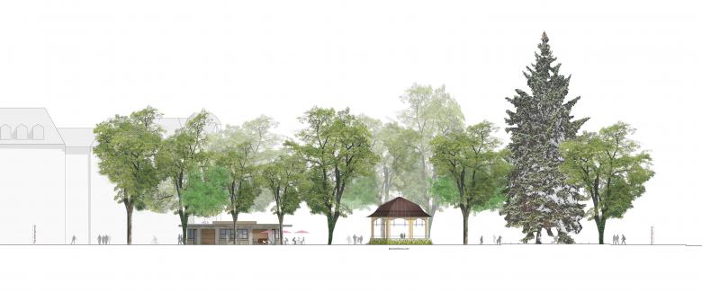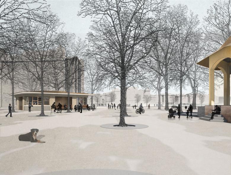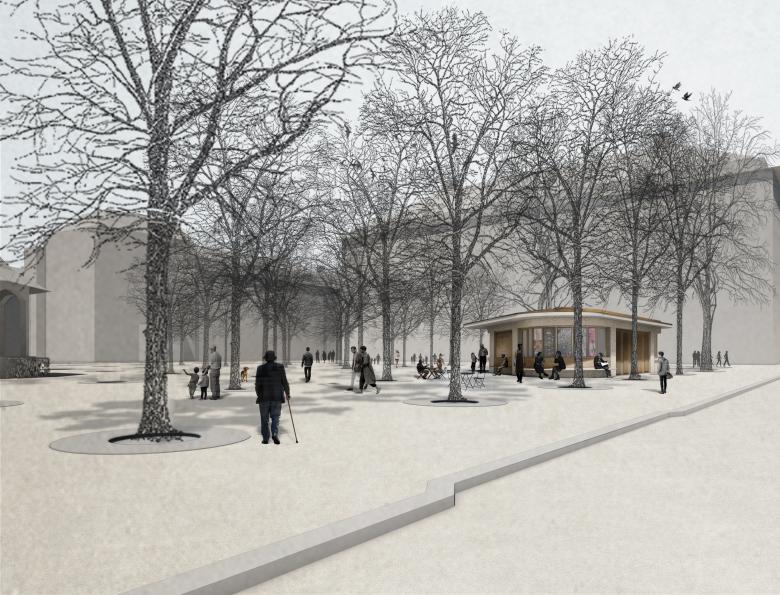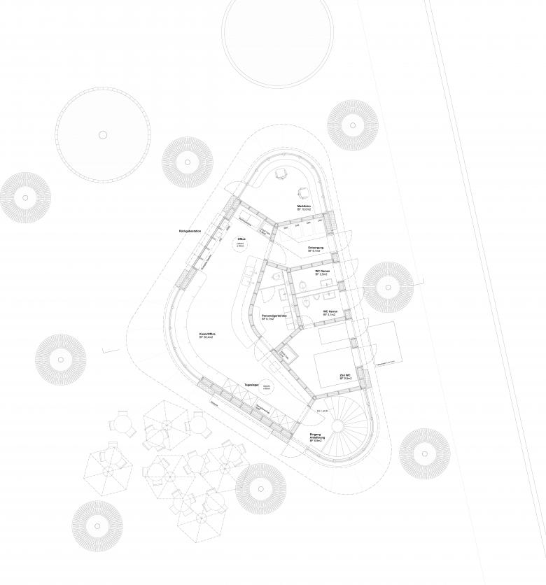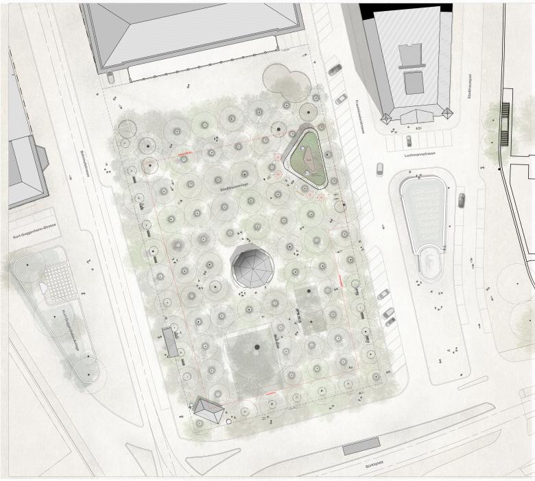 Durch das Wegfallen der Hecken und die Vervollständigung des Baumrasters wird die Wahrnehmung des Baumvolumens auf der Stadthausanlage von Aussen gestärkt, während das Erdgeschoss durchlässig wird. Der Kioskneubau soll sich, wie die bestehenden Kleinbauten auf der Anlage, diesen räumlichen Qualitäten unterordnen. Die abgerundete dreieckige Grundform ohne Vorder- und Rückseite lehnt sich an den ebenfalls allseitig orientierten Musikpavillon von Robert Maillart an, verleiht dem Gebäude jedoch eine eigenständige Präsenz innerhalb der Stadthausanlage. Durch die Rundungen fliessen die drei Fassaden kontinuierlich um das Haus und stellen einen formalen Bezug zu den Kleinbauten zwischen Paradeplatz und Bellevue her. Aus jeder Perspektive heraus präsentiert sich das Gebäude gleichwertig und ohne Hierarchie. Die Nutzungen sind allseitig angeordnet, wobei die Hauptnutzungen jeweils in den Rundungen liegen.