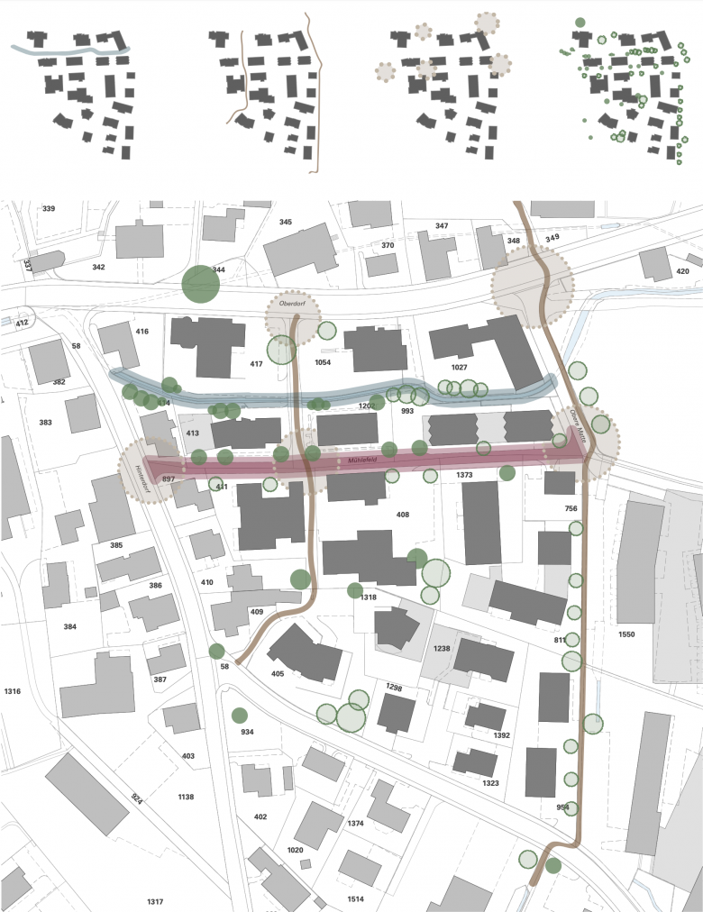 Basierend auf einer detaillierten Quartieranalyse beschreibt das Konzept die Charaktere einzelner Teilbereiche, formuliert differenzierte Gestaltungsziele und zeigt Bedingungen auf, unter denen zusätzliche Gebäudehöhen geprüft werden können. Es legt dabei bewusst keine starren Höchstmasse fest, sondern beurteilt Volumina anhand ihrer sichtbaren Geschossigkeit zur Strassenseite. Ziel ist eine abgestufte, ortsverträgliche Verdichtung, die den Übergang zur Landschaft respektiert, identitätsstiftende Freiräume schafft und zur Aufwertung des gesamten Quartiers beiträgt.