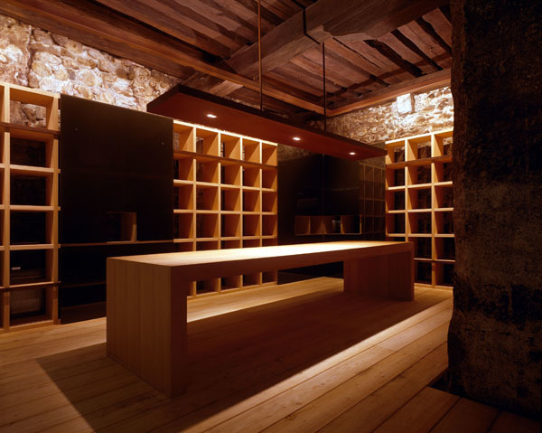 statt umbau eine „möblierung“. ein großer tisch und lineare regale sind die dominierenden elemente im hauptraum. große glasplatten in der farbe leerer weinflaschen haben „fenster“, die einzelne flaschen in szene setzen und sich verschieben lassen. warme holz-, braun-, und flaschentöne. an einer wand zieht sich eine eisenplatte entlang, gerostet, aus der fenster ausgeschnitten sind. mauer und flaschen wirken darin wie bilder. auf der anderen seite ein handlauf aus korkdeckeln. die treppe wurde etwas verlängert und eine lineare holzstiege daraufgesetzt.
