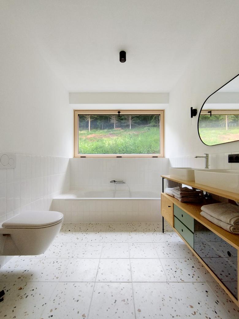 Die Tragstruktur des Bestandsgebäudes bleibt erhalten. Die Kojen aus Brettsperrholz werden über das Dach mithilfe von Zugbändern miteinander verbunden und gleichen so die Lasten aus. Sie heben sich durch eine dunkle Blechverkleidung bewusst von der schlichten Weißtannenfassade ab. Der Innenraum wird mit weiß verputzten Wänden und hellen Terrazzofliesen ruhig gehalten und durch Möbel aus Weißtanne ergänzt. Das energetische Konzept wird mit einer Luftwärmepumpe bewusst einfach und effizient gestaltet. Die Dämmung aus nachwachsenden Rohstoffen und der hohe Anteil an heimischem Nadelholz senken den ökologischen Fußabdruck.