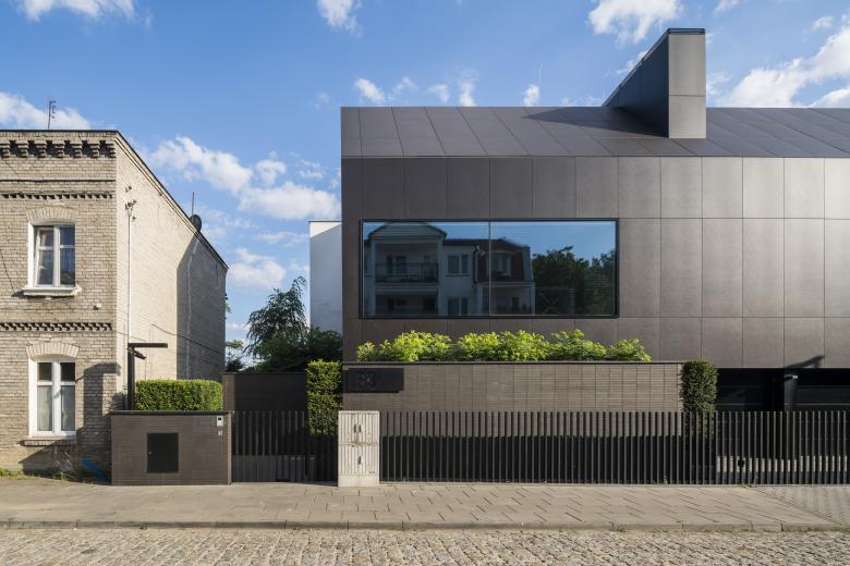 Das dunkle, geneigte Dach zur Straßenseite hin wurde mit Rücksicht auf das Straßenbild entworfen. Die einheitliche Verkleidung der Fassaden und des Daches mit schwarzen Platten von Swisspearl sowie das Fehlen eines Traufüberstandes abstrahieren die formale Vorstellung von einem Haus. In diesem Bereich befinden sich auch eine Doppelgarage, eine Waschküche und einige technische Räume. Ein einziges, großes horizontales Fenster ist zur Straße hin ausgerichtet.