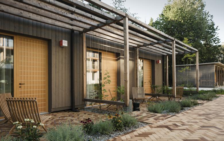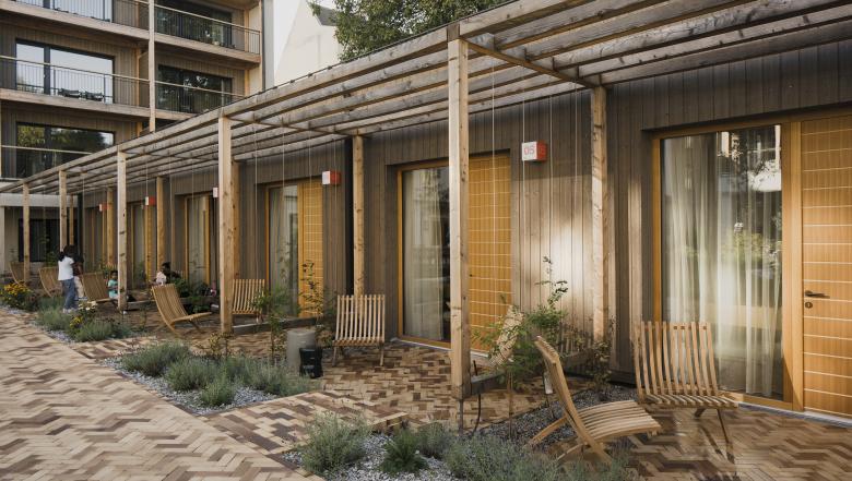 Der Innenhof, als grüne Lunge des Projekts, setzt ein deutliches ökologisches Zeichen gegen urbane Hitzeinseln. Die begrünten Flächen werden durch Aufenthalts- und Begegnungszonen ergänzt, die zur Kommunikation und zum Verweilen einladen. Der Gemeinschaftsgarten bietet Raum für den Anbau von Kräutern, Beeren und Gemüse, wodurch eine nachhaltige und gemeinschaftliche Nutzung gefördert wird. Gleichzeitig verbindet der Nachbarschaftsgarten die beiden Wohnbauten miteinander und bietet Platz für Aufenthalts- und Spielmöglichkeiten. Entlang der Loggien sorgt ein üppiger Blütenstreifen für eine harmonische Gestaltung und zusätzliche Privatsphäre.