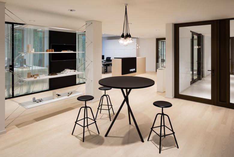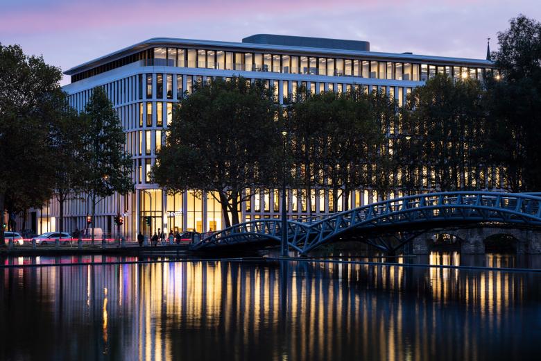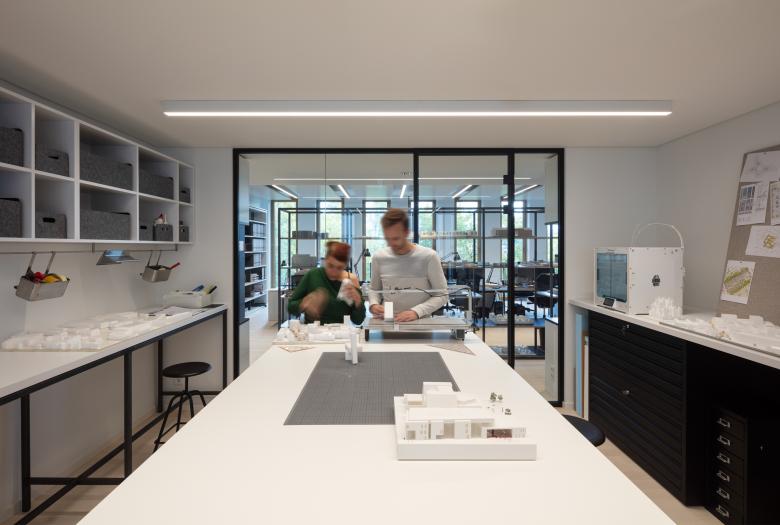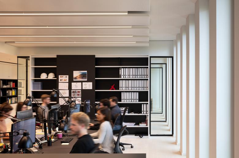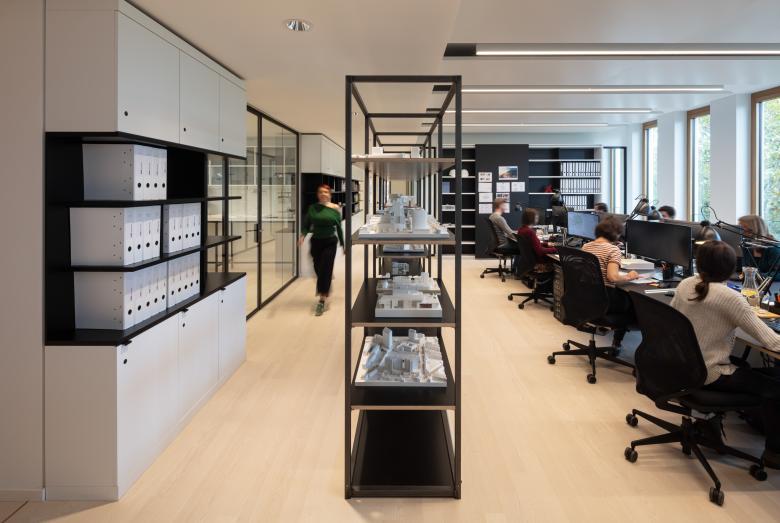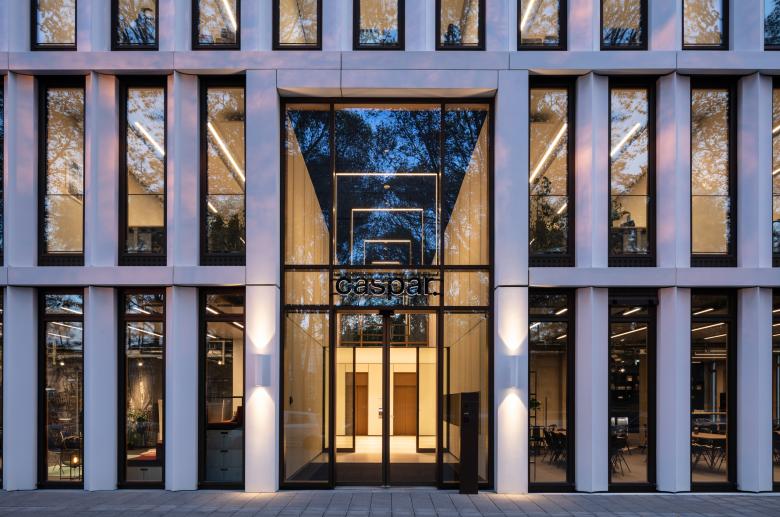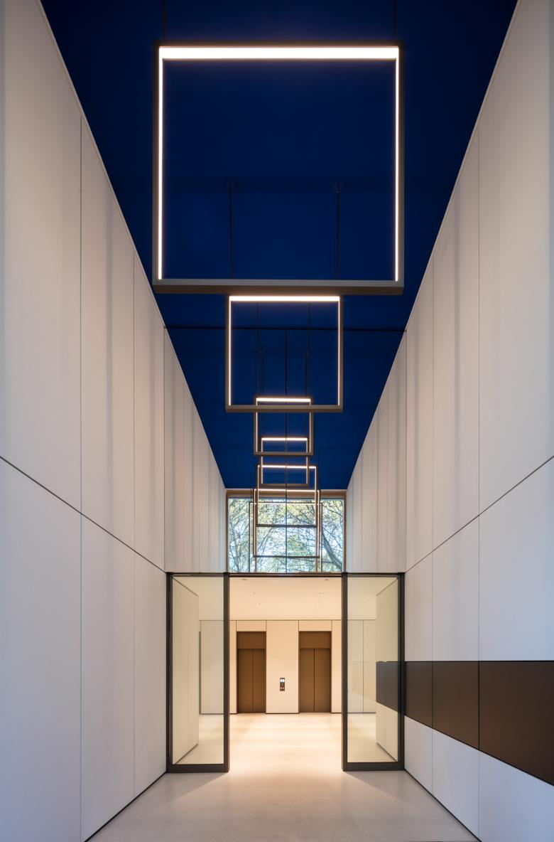 Die Innenräume des Kaiserhofs sind mit hochwertigen und langlebigen Materialien ausgestattet. Die Fensterrahmen, außen Aluminium, innen Eichenholz erzeugen einen warmen Grundton, der Terrazzo in den Lobbys zitiert das Material der Fassade. Ein feines Detail sind hier auch die in Preußischblau gestrichenen Deckenuntersichten – Kaiserliches, das nicht goldglänzen muss, um zu wirken. Das Multi-Tennant-Gebäude bietet 17.900 Quadratmeter BGF und verfügt über zwei Adressen für die Mieter:innen und die Eventflächen. In Ergänzung zu der innerstädtisch guten ÖPNV Anbindung gibt es eine dreigeschossige Tiefgarage mit Stellplätzen und Ladestationen, damit der Straßenraum der umliegenden Quartiere nicht unter dem ruhenden Verkehr zu leiden hat. Natürlich haben wir uns über die Auszeichnung mit dem Iconic Design Award 2020 und dem German Design Award Special 2021 für den Kaiserhof gefreut, sehr glücklich sind wir aber auch darüber, dass unser eigenes Büro seit dem Sommer 2019 die vierte Etage bezogen hat und nun die eignen Büroräume als lebendige Visitenkarte nutzen kann.