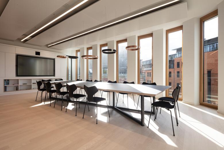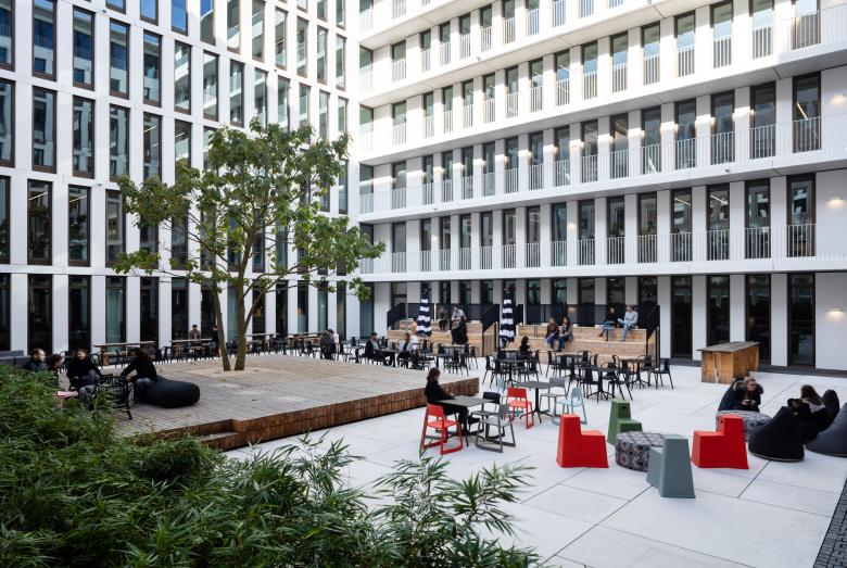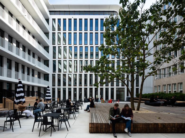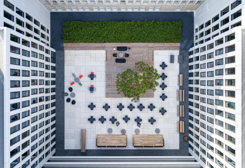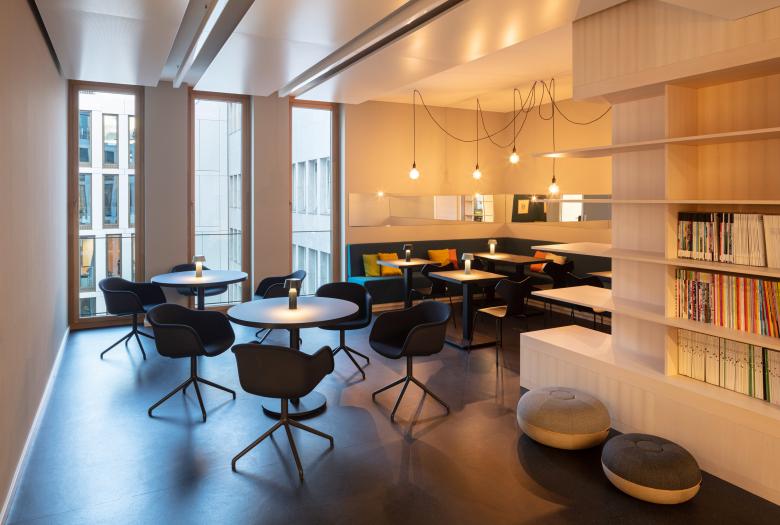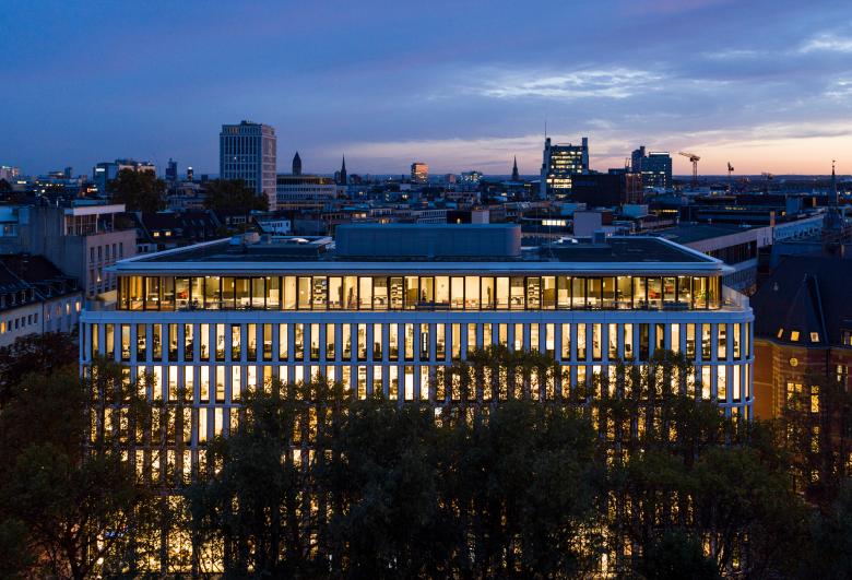 Wer auf einer der sechs Büroetagen arbeitet, blickt ins Grüne, durch die lichten Kronen der Bäume auf dem neu angelegten Vorplatz, der die urbane Natur am Saum des Mediaparks aufnimmt und an die flankierenden Alleen weiterleitet. Oder der Blick fällt in den lichten Innenhof, den das Bürohaus mit seiner C-Form umfasst. Als Teil der Bürolandschaft bietet er einen einladend möblierten geschützten Freiraum für Informelles und Erholsames. Das oberste Geschoss, als Staffelgeschoss eingerückt, entzieht sich der Wahrnehmung der Passanten, allein sein filigran auskragendes Dach, das die gerundeten Gebäudeecken nachzeichnet, kragt umlaufend grade so dezent heraus, dass es den Baukörper schlüssig abschließt. Und, wenn man es so sehen will, ist dies eine kleine Reverence an die Eleganz der 50er Jahre, die auch heute noch an einigen Stellen der Kölner Ringe zu entdecken ist. Auch hier oben gibt es Büroräume, in den beiden Köpfen liegen die Bibliothek und ein Schulungsraum, beide öffnen sich auf eine Dachterrasse, die, so gefällt es in Köln, natürlich den Dom im Blick hat.