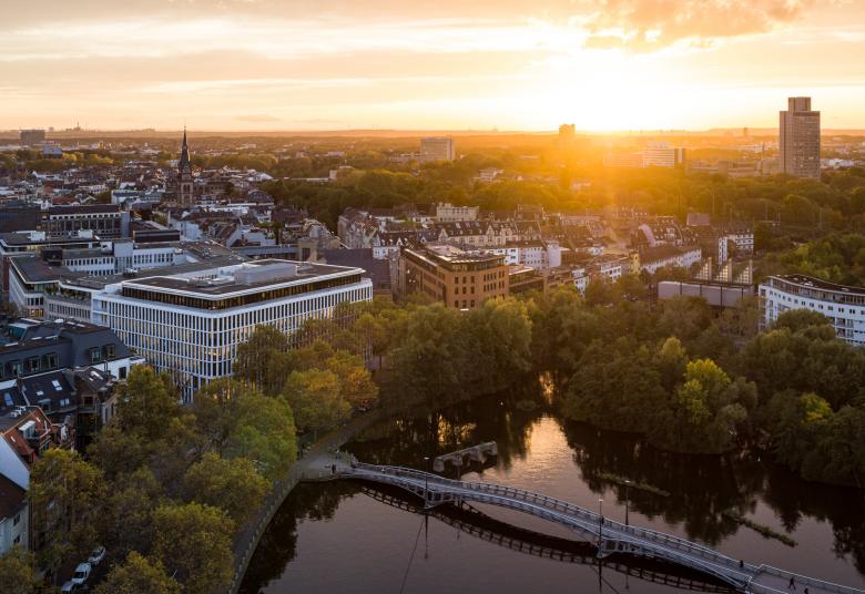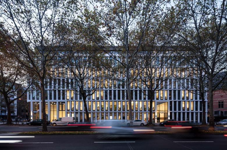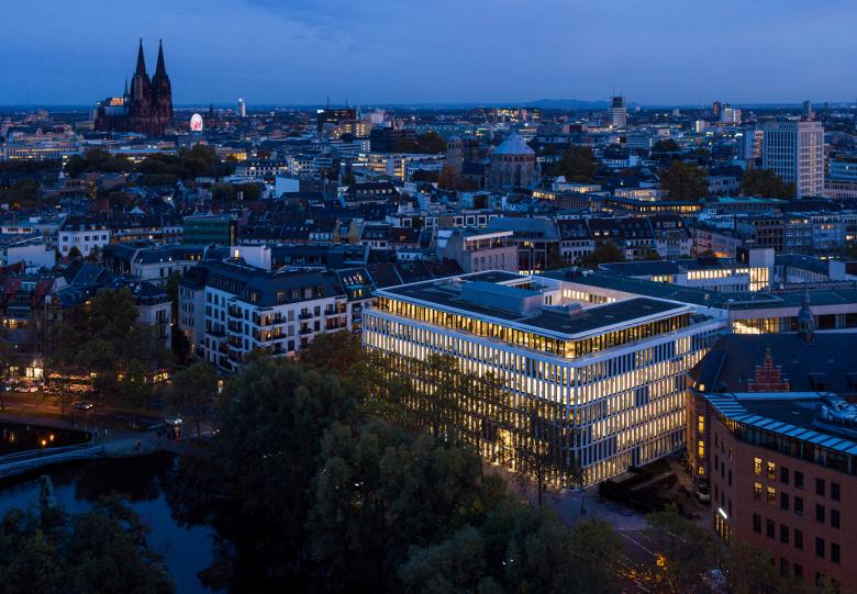 Nicht jede Bestandsimmobilie hat des Potential zum Weiterbauen. So bestätigte eine Machbarkeitsstudie dem 1969 errichteten düsteren Kopfbau eines denkmalgeschützten Büroensembles am Kaiser-Wilhelm-Ring eine ungenügende Eignung zur Transformation. An seiner Stelle steht seit 2019 der Kaiser Hof, ein lebendiger Bürostandort, mit dem die frühere Rückseite zur Front wird. Die konsequent und nahtlos von der Schwelle bis zur Attika an drei Seiten mit runden Ecken um den Neubau gezogene markante Fassade gibt ihm die Erscheinung eines Solitärs, doch fügt sich seine Kubatur im Sinne eines Stadtbausteins harmonisch in die gewachsene Nachbarschaft ein. Zwischen den schmuckvollen Gründerzeitblöcken, in denen oft pragmatische Nachkriegsbauten Lücken geschlossen haben und den großen Gesten, mit denen der gegenüberliegende MediaPark vom Zeitgeist der 90er Jahre berichtet, steht der Kaiser Hof bemerkenswert ruhig da.