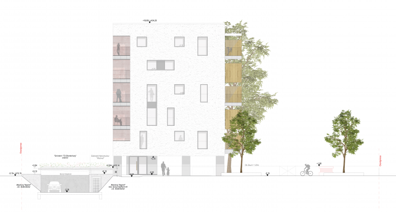 Die Westfassade wird Richtung Salzach in großzügige Balkonzonen aufgelöst und durch Außenabstellboxen gegliedert.