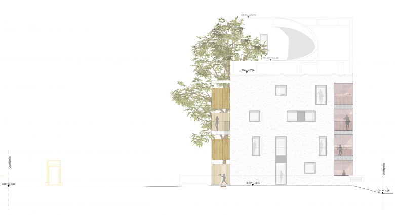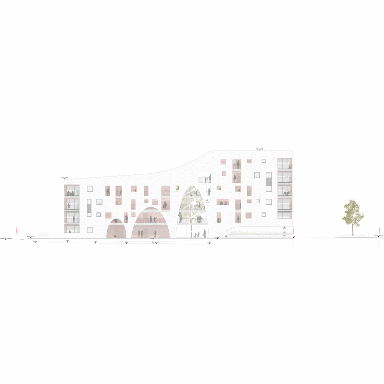 Das Gebäude wird parallel zum Josef Mayburger-Kai positioniert und über die Adolf-Kolping im Norden erschlossen. Der Riegel wird durch die erhaltenswerte Esche in zwei Baukörper geteilt. In dieser Zäsur wird die Freitreppe positioniert. Somit wird das offene Erschließungssystem als Teil einer vertikalen Stadtlandschaft bzw. Tribüne zum ASKÖ-Sportplatz verstanden, die sich bis zur einzelnen Wohnungseingangstür durch den Laubengang erstreckt.