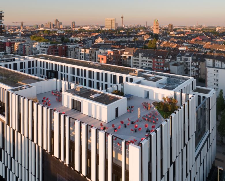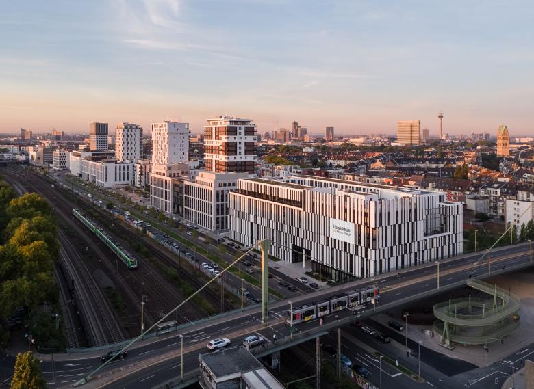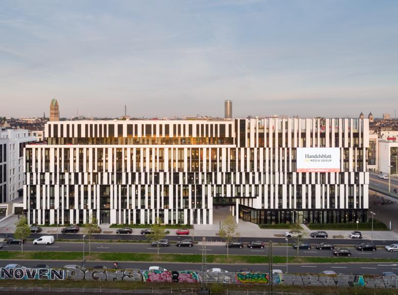 Viele Medienunternehmen sind nach Berlin gezogen, um nah am Geschehen zu sein und um selbst Teil des Geschehens zu werden. Die Handelsblatt Media Group hielt an ihrem Standort in Düsseldorf fest und setzte dort 2017 mit dem Einzug in ihr neues Verlagshaus ein starkes Zeichen für Sichtbarkeit und Offenheit. Im Maßstab der Stadt betrachtet, ist das Verlagshaus ein wichtiger Baustein der Neuen Stadtquartiere Derendorf, die auf dem Gelände des ehemaligen Güterbahnhofs entwickelt wurden. La Tête bildet den Abschluss einer Reihe von Neubauten an der Toulouser Allee, gegenüber einem großen Park und direkt an der Franklin-Brücke. Doch geht es hier nicht nur um den flüchtigen Moment des Gesehenwerdens, sondern auch um eine neue Medienkultur, die ihrem Umfeld offen begegnet und in ihrer internen Struktur maximale Freiheit und Transparenz kultiviert.