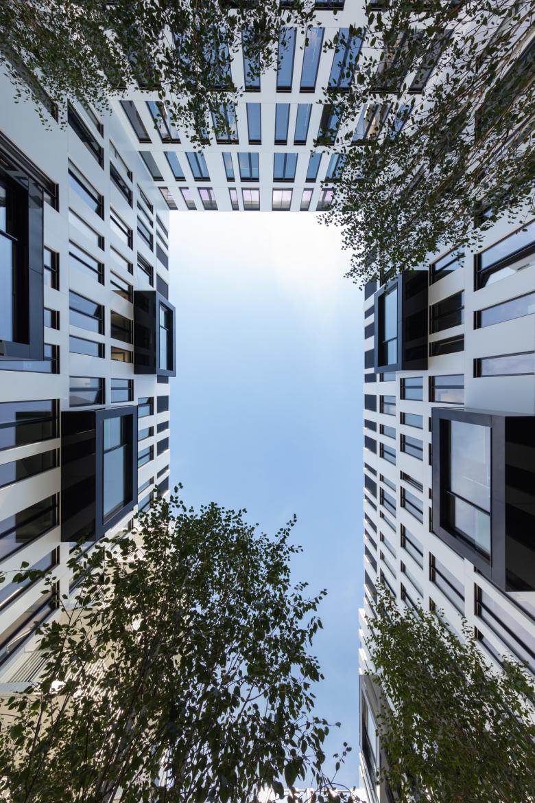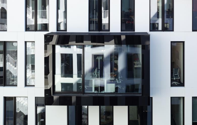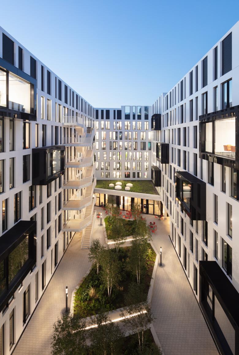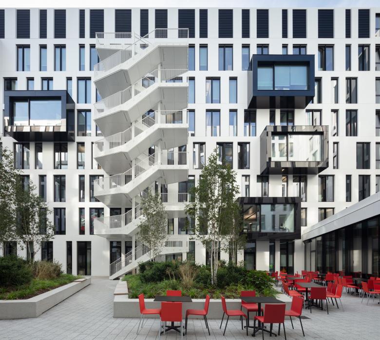 Die Architektur von La Tête zeigt sich offen und hierarchiefrei – es gibt keine Chefetage mehr, und der Innenhof, einladend gestaltet mit Sitzmöbeln im Birkenhain, kann von allen genutzt werden. Damit sind nicht nur alle gemeint, die im Haus arbeiten, sondern auch die Nachbar:innen oder Passant:innen, die übrigens auch zum Zeitunglesen in der Lobby willkommen sind. Die im Gebäude liegende Town Hall ist ebenfalls öffentlich zugänglich, der direkte Austausch ist gewünscht. Sogar Veranstaltungen mit Publikum finden hier statt. Das Geschehen in Haus und Hof hat man aus den Cubes – kleinen, variabel bespielbaren Freiräumen, die wie Schubladen aus der weißen Lochfassade gezogen in den Innenhof ragen – gut im Blick. Ganz oben liegt geschützt hinter der hochgezogenen Glasfassade ein großer Skygarden, der allen Mitarbeiter:innen offensteht und über den Dächern der Stadt einen besonderen Rahmen für Veranstaltungen bietet.