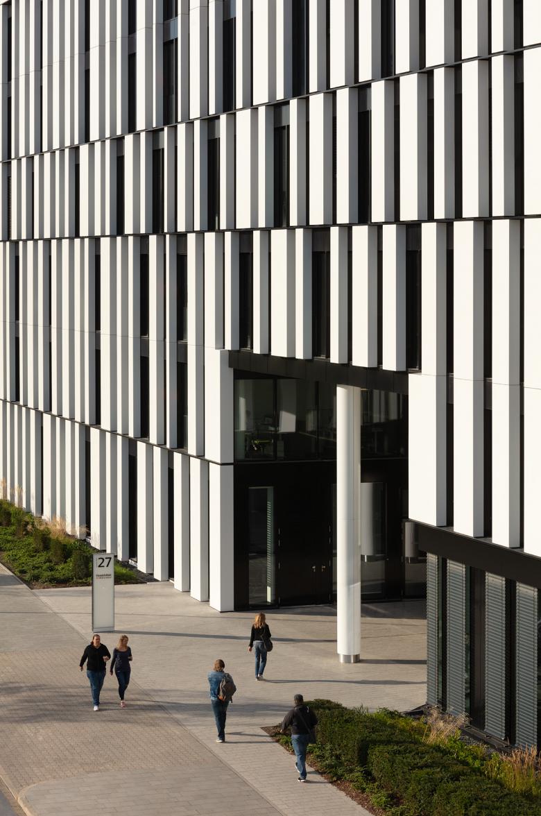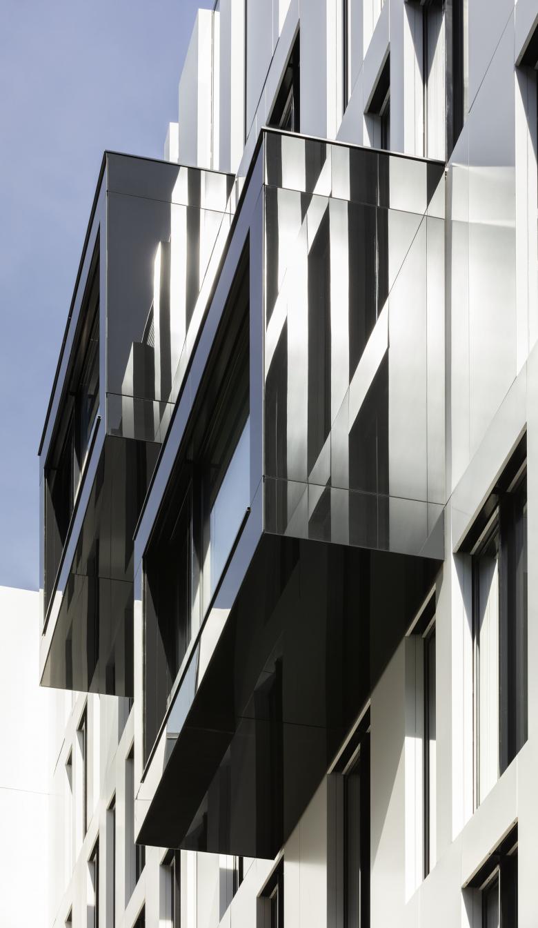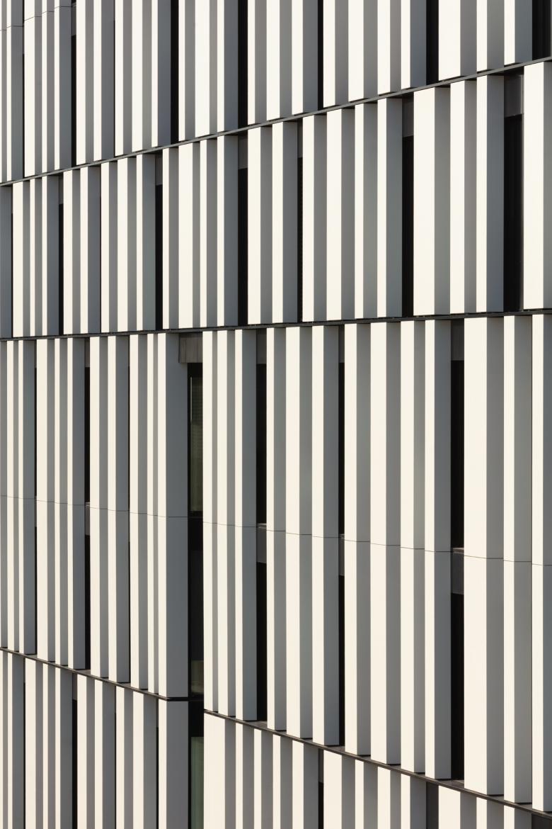 Mehrere hunderttausend Menschen passieren La Tête täglich, ob mit dem Zug oder mit der Straßenbahn, dem Auto oder dem Fahrrad. Das Verlagshaus hat die einfache Form eines Quaders – mit sieben Geschossen und einem Dachgarten. Sauber sitzt das Gebäude, etwa doppelt so lang wie breit, an den Blockrändern. Die simple Kubatur gab uns maximale Freiheit für die Gestaltung einer hochfunktionalen und zeichenhaften Fassade. Der Zeit und dem Medienkontext angemessen haben wir die Digitalisierung zum Thema gemacht und das Haus in einen 30 Meter hohen Barcode gehüllt. Auf Höhe der Geschossdecken wurde das Streifenmuster zerschnitten und horizontal verschoben. Materialisiert haben wir nicht die schwarzen Streifen, sondern die Zwischenräume mit mehrfach gekanteten, schneeweiß pulverbeschichteten Aluminiumblechpaneelen, die vor der Elementfassade mit schwarzen Blenden und feinen vertikal durchlaufenden Schwertern montiert wurden. Dieses Haus scheint in Bewegung zu sein, es möchte sich zeigen, möchte in Erinnerung bleiben. Wirklich bewegt sind die Bilder auf dem 80 Quadratmeter großen Bildschirm, hier kommen die Nachrichten auf kürzestem Weg von den Schreibtischen der Redaktionen hinaus in die Stadt.