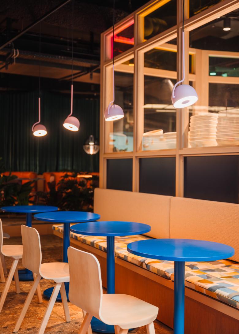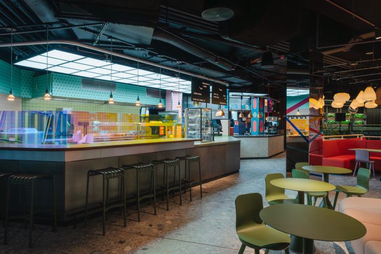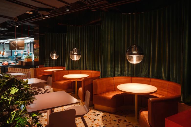 The base lighting for the space is designed with spotlights that are highly customizable. Special fixtures were chosen for their interchangeability – both in light quality and distribution. This not only makes the space highly flexible, but also more sustainable. . It offers longevity if a different atmosphere is required at a later date or adjustments are made within the catering areas. Below this level of general lighting are individual zones that are playfully designed to signal the variety of food on offer. For example, while lanterns create a cloud of light over the Asian cuisine, in another area, Mexican tacos are showcased with pendant luminaires. Other special designs include cantilevered fixtures integrated into furniture and plate-shaped pendants with mirrors and plants. A main feature of the market are the food stands which showcase the chefs like actors on a stage. Dimmable panels with tunable white light float above the chefs, casting them in the right light at the right time. The tunable white light reacts to and compensates for the lack of natural daylight in this area of the market. The atmosphere in the catering area is particularly dependent on the time of day: during the day, the incident daylight from the glass dome is supplemented by the artificial lighting that illuminates the seating areas brightly and generously; in the evening, the space is transformed into a warm, high-contrast atmosphere with accents on tables.