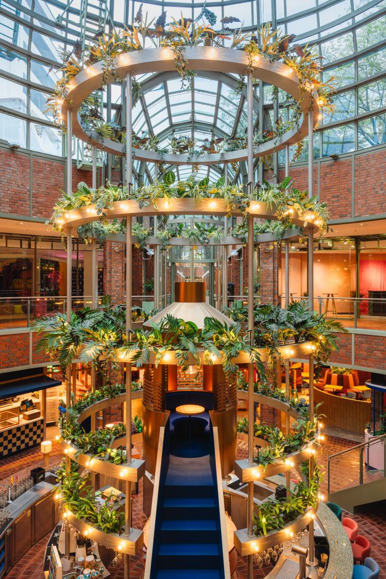 A particular challenge was not only the preservation of the postmodern jewel designed by gmp Architekten in 1980, but also the location of the restaurant in the basement of the Hanseviertel. Studio De Schutter created an atmosphere that invites you to linger in winter and summer, day and night. The lighting concept balances the different lighting conditions between bright daylight zones and low-light areas by compensating for the lack of daylight on the one hand and setting specific accents on the other. The attraction and highlight of Le big TamTam is the centrally located bar under the dome. With a total of five horizontal planting rings, the bar construction extends beyond the first floor of the Hanseviertel providing the necessary long-distance effect and orientation. In order to do justice to this exposed location and to precisely coordinate the lighting with the construction and monument authorities, Studio De Schutter and the planning teams of studio aisslinger and gmp Architekten built a section of the centerpiece as a 1:1 model. More than one hundred LED cabochons – the typical fairground canopy lights – announce Le big TamTam. Studio De Schutter staged the lighting of the plants arranged in rings with integrated zoom spotlights.