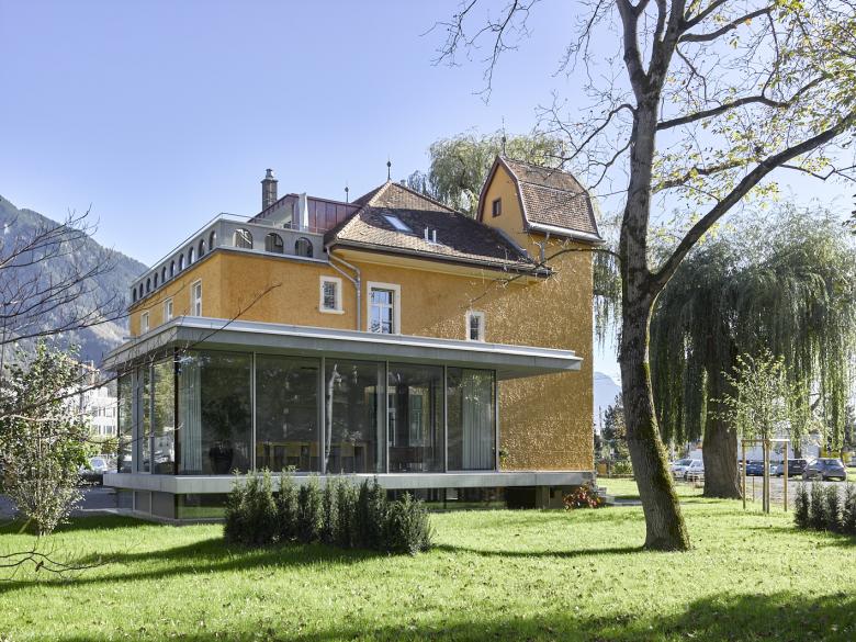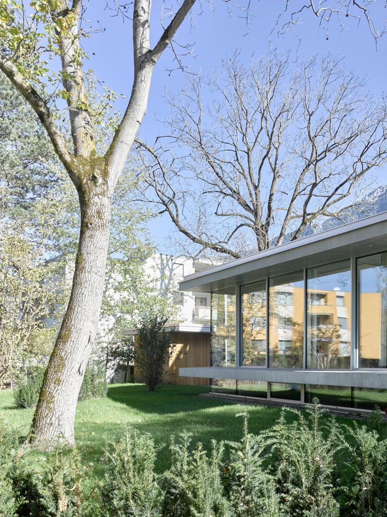 Die zeitlos gehaltenen Nebenbauten betten sich dezent in die Parkanlage ein. Der Pavillon erweitert den Wohnraum der Villa und schafft durch seine Glaselemente einen freien, grosszügigen Blick in die Grünanlage. Die Glaselemente des Pavillons kommen auch im Innern zum Einsatz, vergrössern den Wohnraum optisch und können bei Bedarf geöffnet werden. Durch die neue Nutzung und die Anbauten sichert sich die Villa auch in Zukunft ihren Platz in der Geschichte von Schaan.