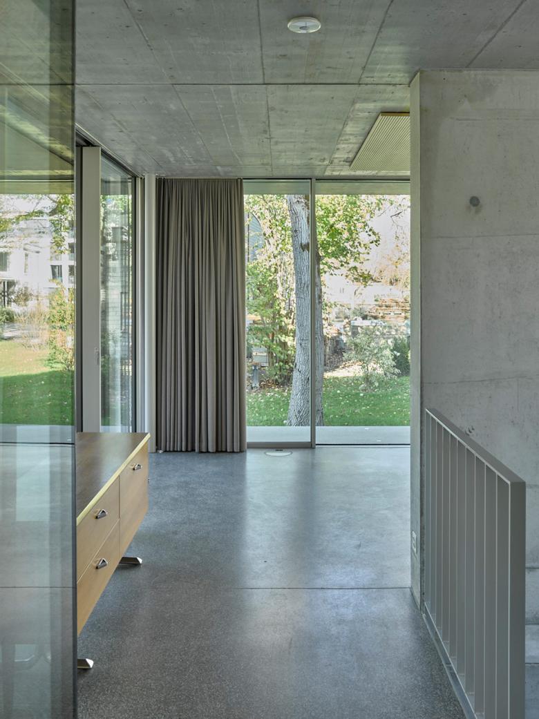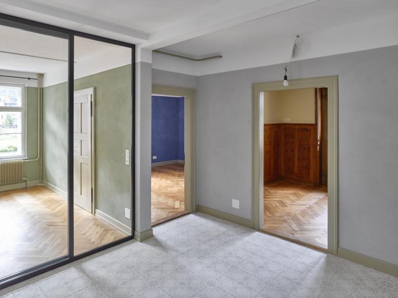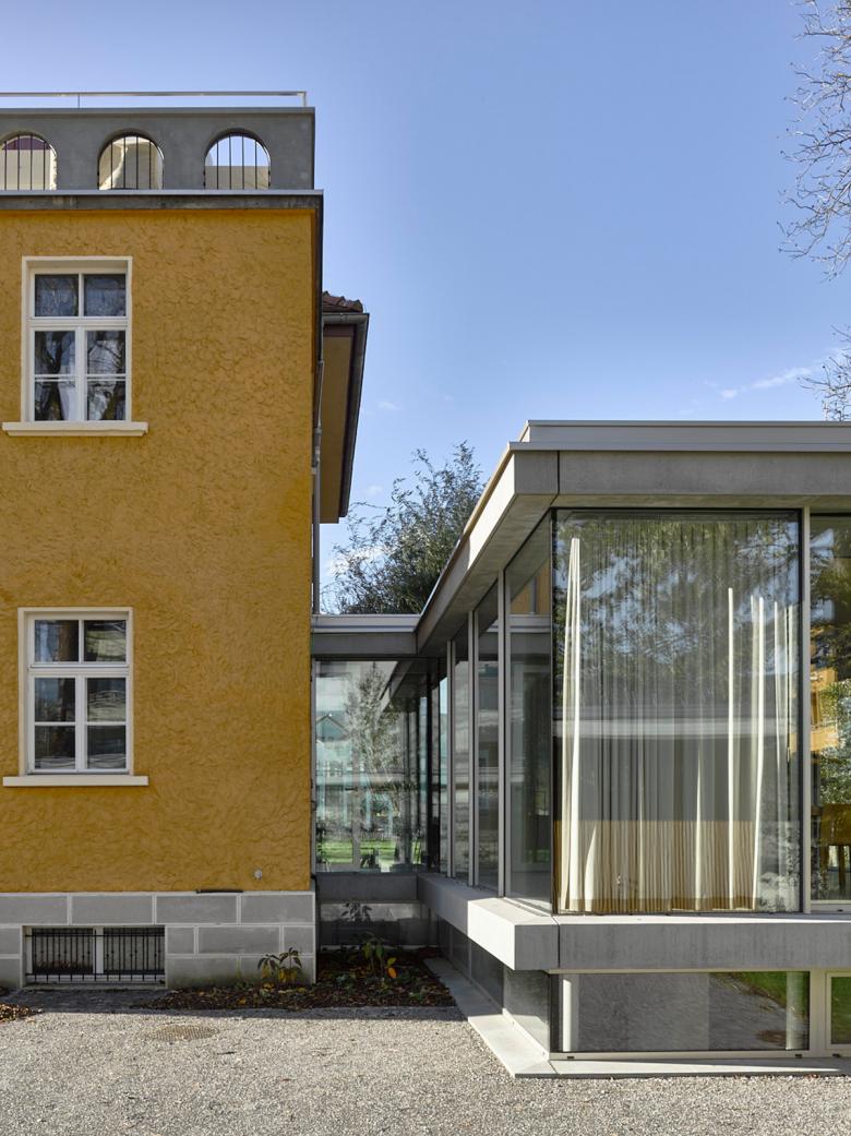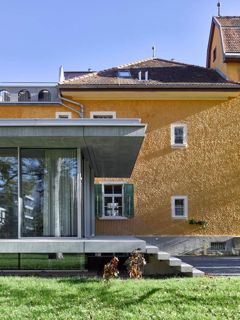 Die schlichte Formensprache der neuen Bauvolumen gliedert sich der geschichtsträchtigen Villa aus dem letzten Jahrhundert unter und hebt ihren architektonischen Wert hervor. Sanfte Eingriffe im Innern schaffen eine neue Nutzung und Teilen das Haus in drei Zonen auf. Dabei entstehen zwei unterschiedliche Wohneinheiten sowie die Möglichkeit eines autark nutzbaren Ateliers. Wo möglich werden lediglich die Oberflächen bearbeitet. In enger Zusammenarbeit mit der Denkmalpflege wurden Lösungen gefunden, welche der Architektur der Villa gerecht werden.