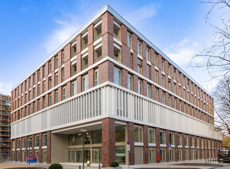 Das charakteristische Element Klinker stellt einen wichtigen Teil der gewachsenen Identität der Stadt Hamburg und insbesondere des Campus dar. Die heterogene Struktur der vorgeschlagenen Klinkerfassade und die funktionale und gestalterische Zonierung der Außenhülle schaffen einen spannenden Dialog mit den benachbarten Baukörpern. Zusätzlich wird durch die Fassadentiefen der Gebäudeelemente der lebendige Eindruck, der durch den unterschiedlichen Schattenwurf entsteht, verstärkt.