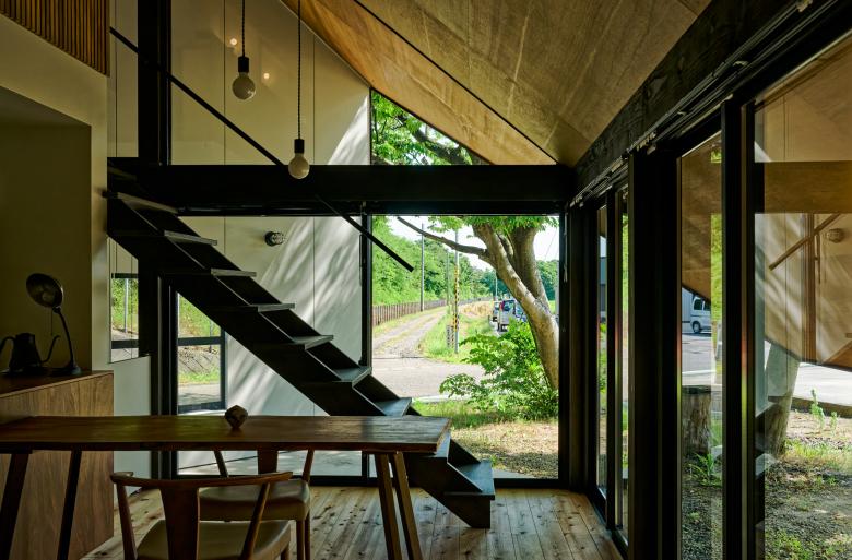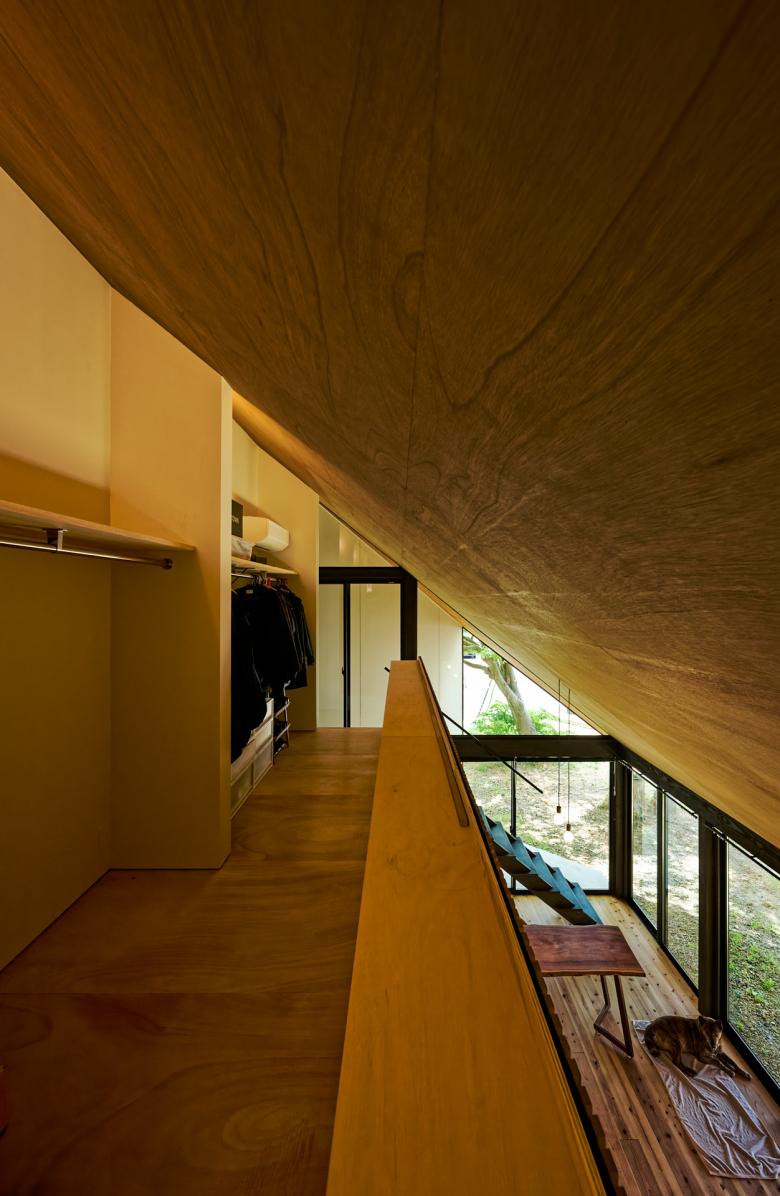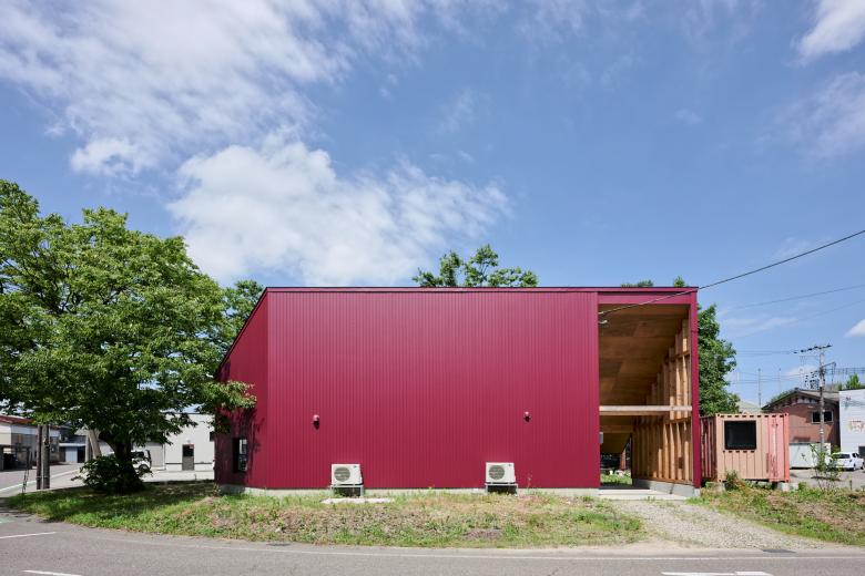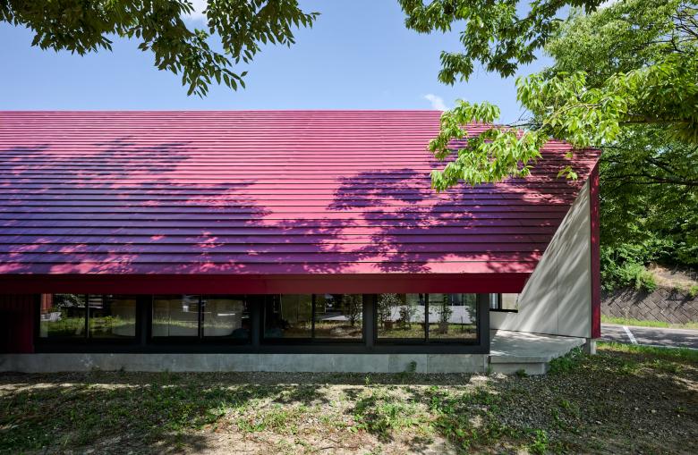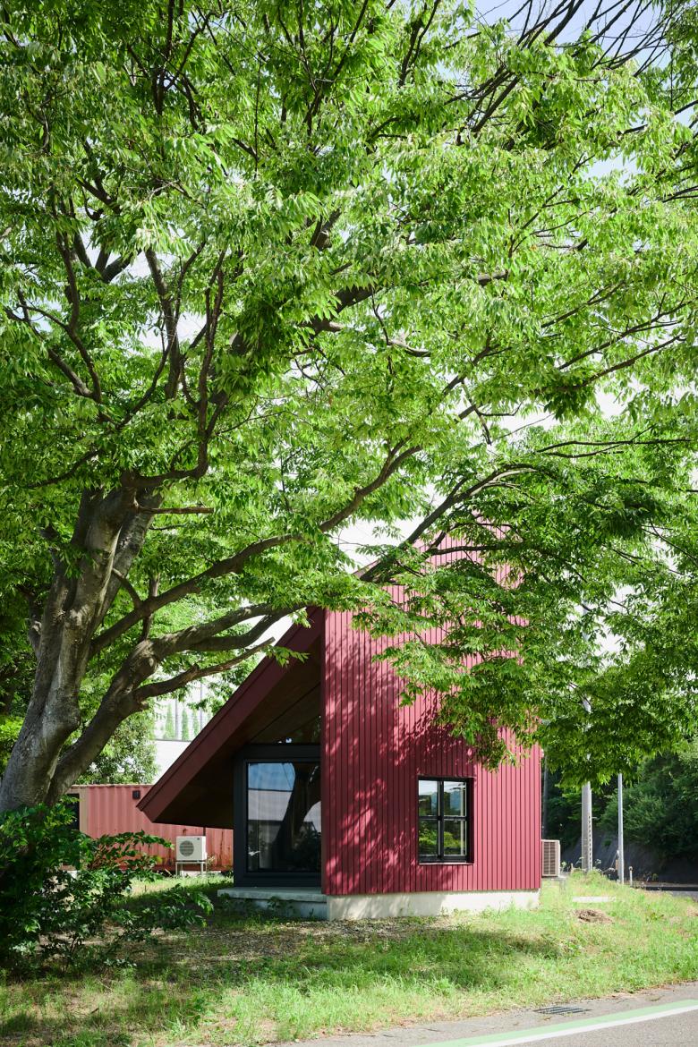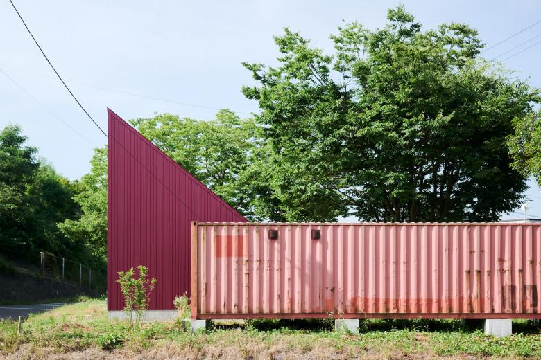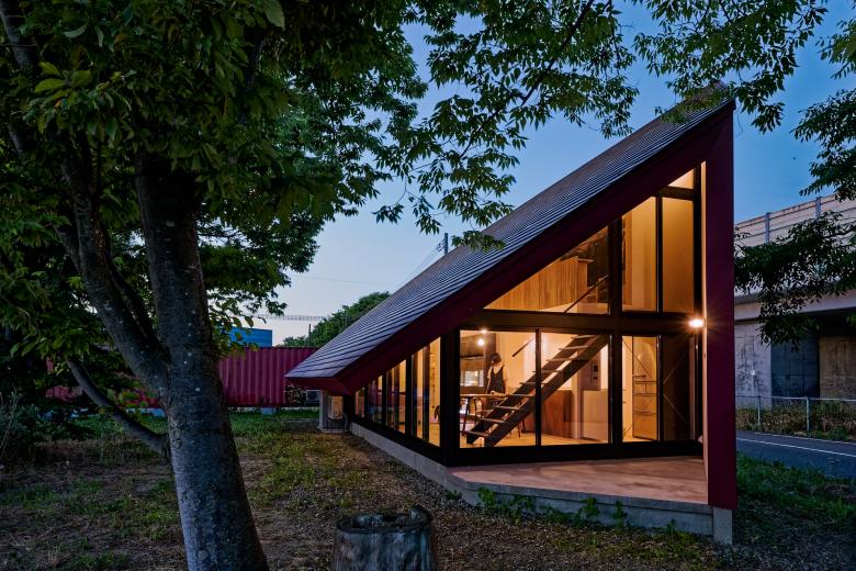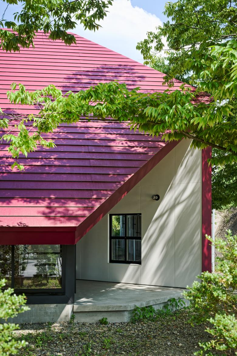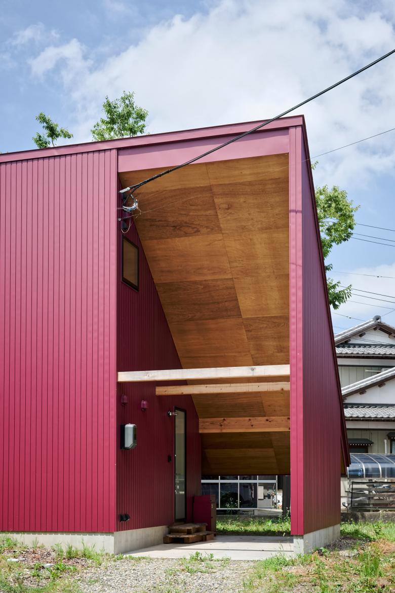 国道と農道に挟まれた三角の敷地で、静けさの中に解放感を求めて、屋根が大きく伸びた赤い三角形の家。