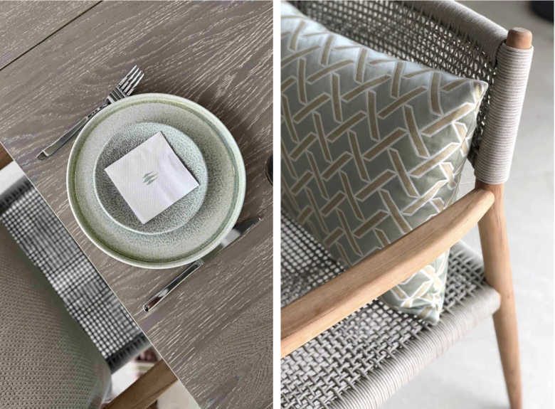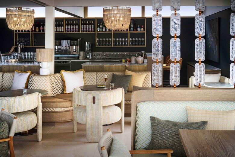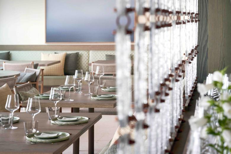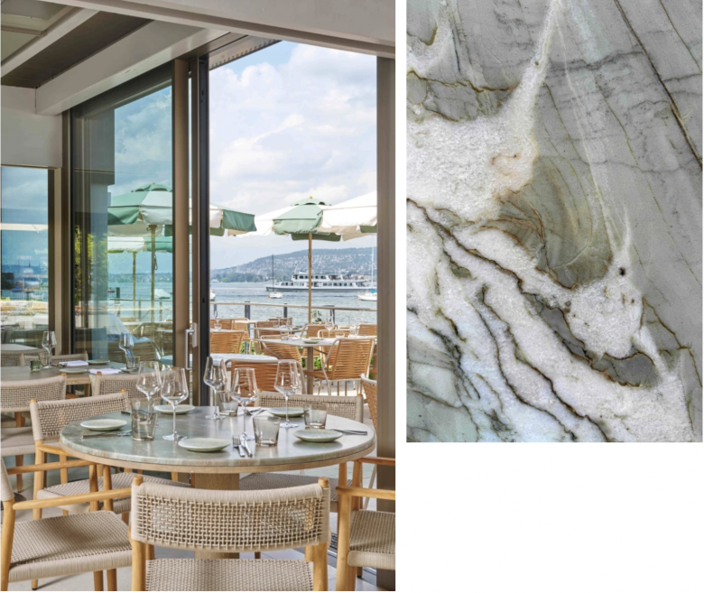 Pale limestone floors evoke sun-drenched Mediterranean terraces. Emerald Jadore quartzite dining tables reflect the shimmering surface of water. Upholstered benches in patterned Dedar fabric recall the relaxed elegance of mid-century beach clubs, reimagined with a modern, understated touch.