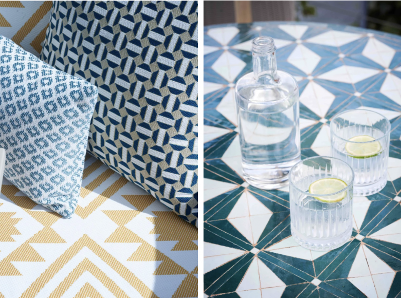 The terrace embodies the restaurant’s effortless charm and Mediterranean spirit. The outdoor area is defined by cold-pressed floor tiles crafted from raw and recycled materials, forming a captivating graphic pattern. Custom-built benches upholstered with luxurious fabrics are enhanced by vibrant accent cushions, while handcrafted mosaic tables introduce an artistic flair. This combination creates a welcoming yet sophisticated outdoor setting perfect for relaxation and enjoyment.