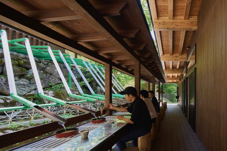 川の対岸を並走するJR釜石線との「見る・見られる」関係性を強く意識した建築計画ですが、山側にも豊かな自然を愛でながら名物「滝流し蕎麦」を楽しめる屋外の居場所が用意されています。