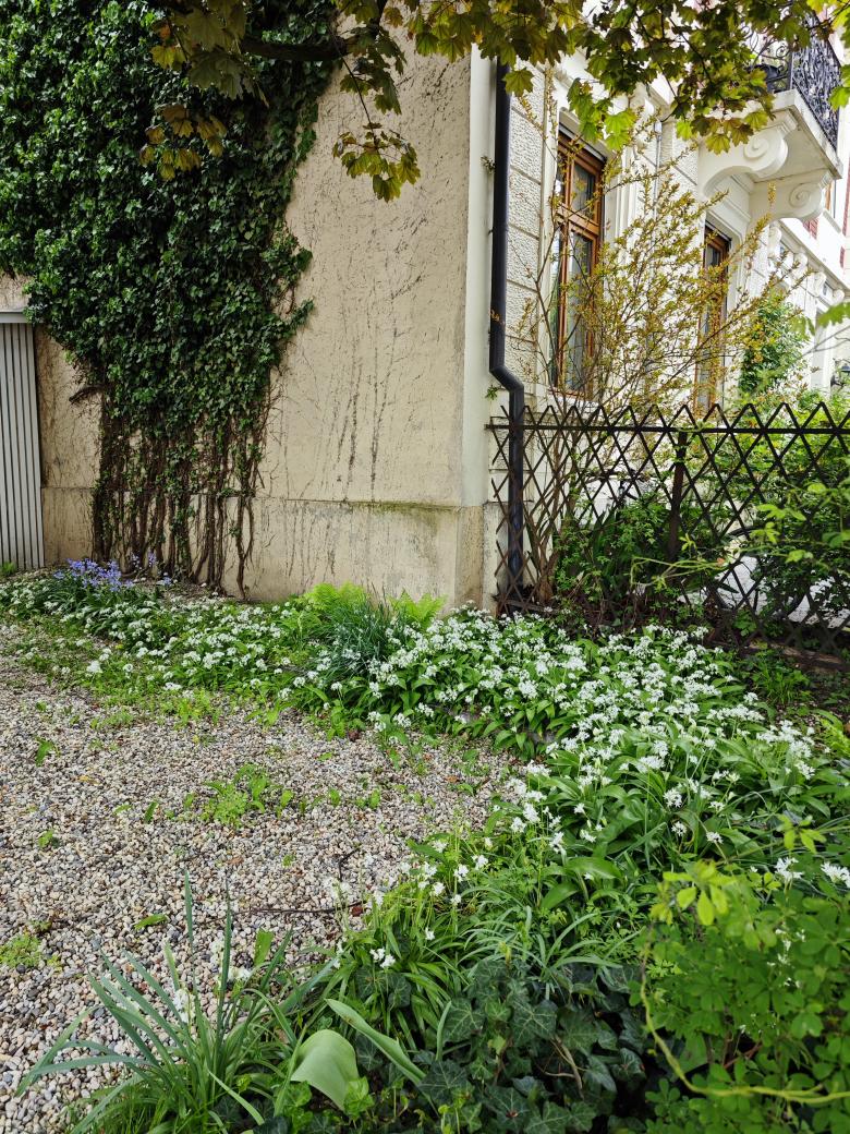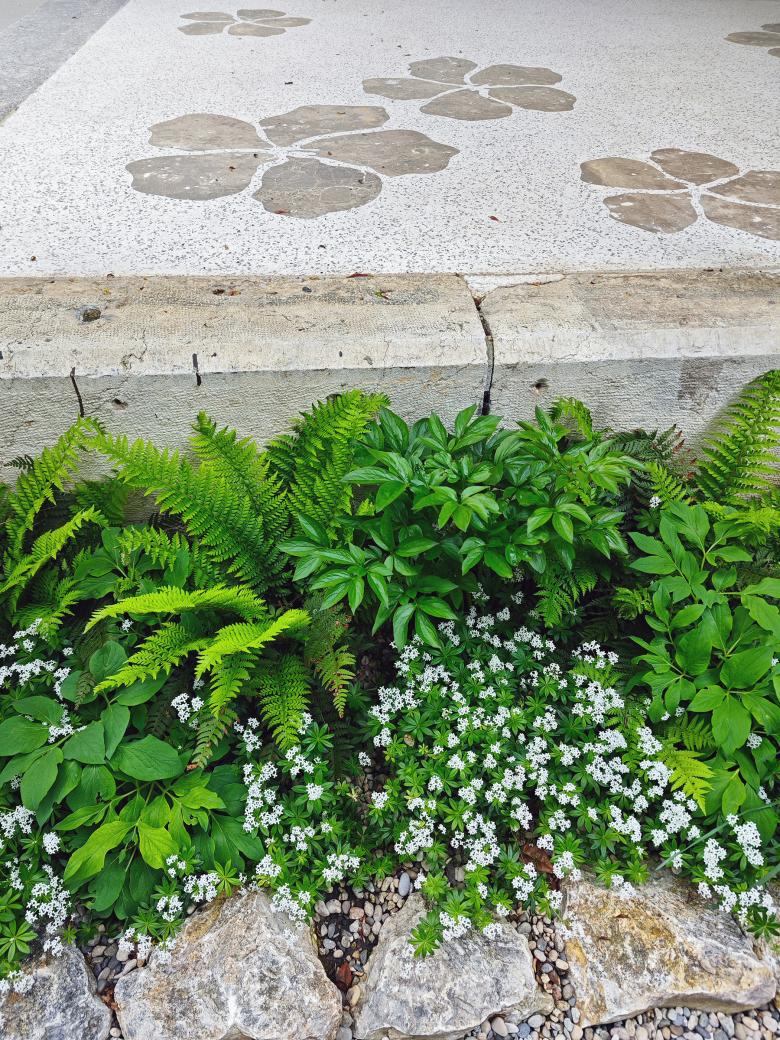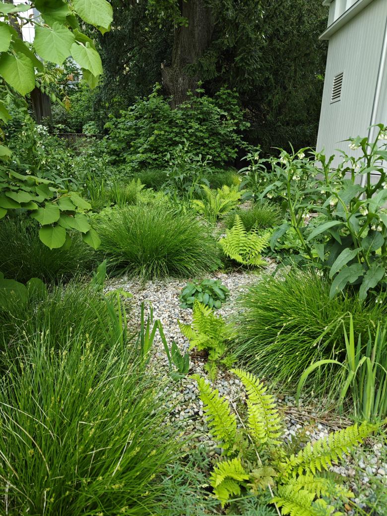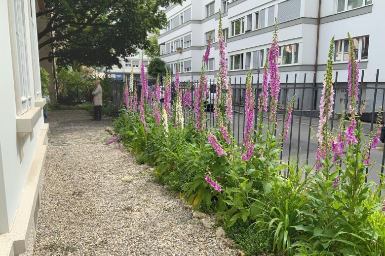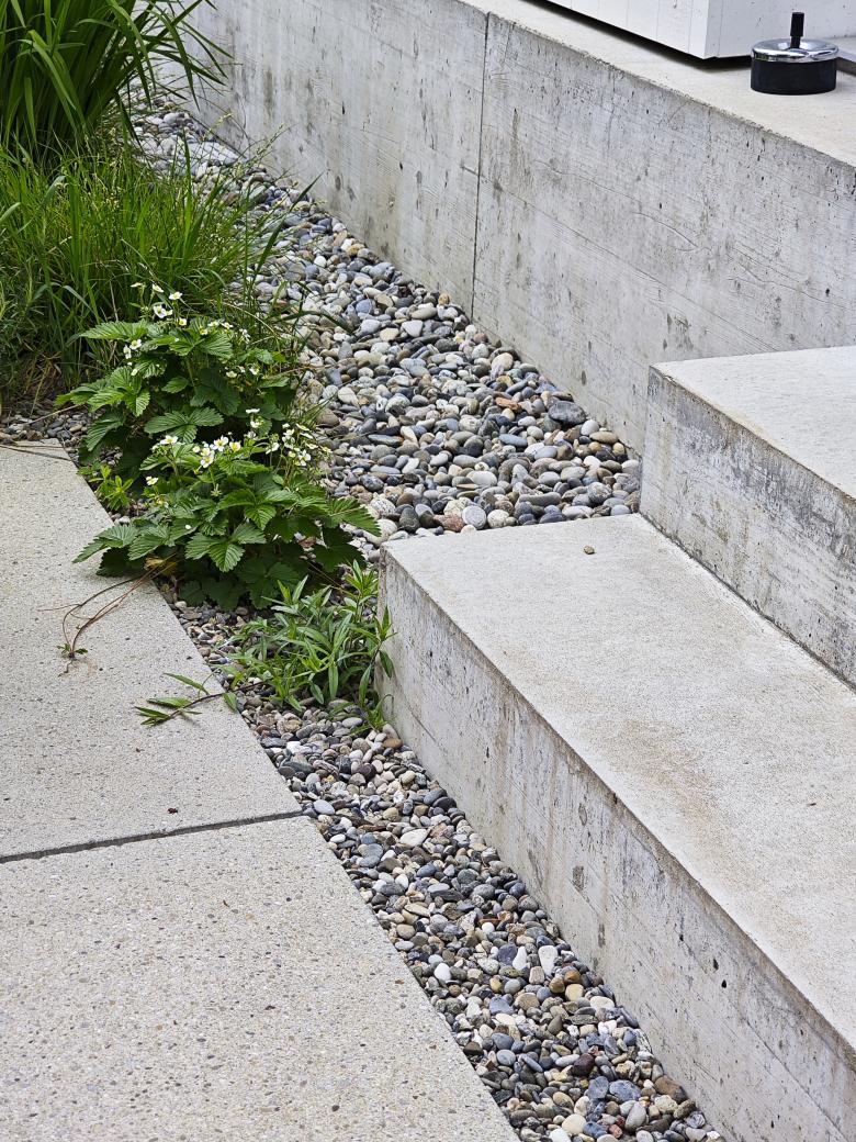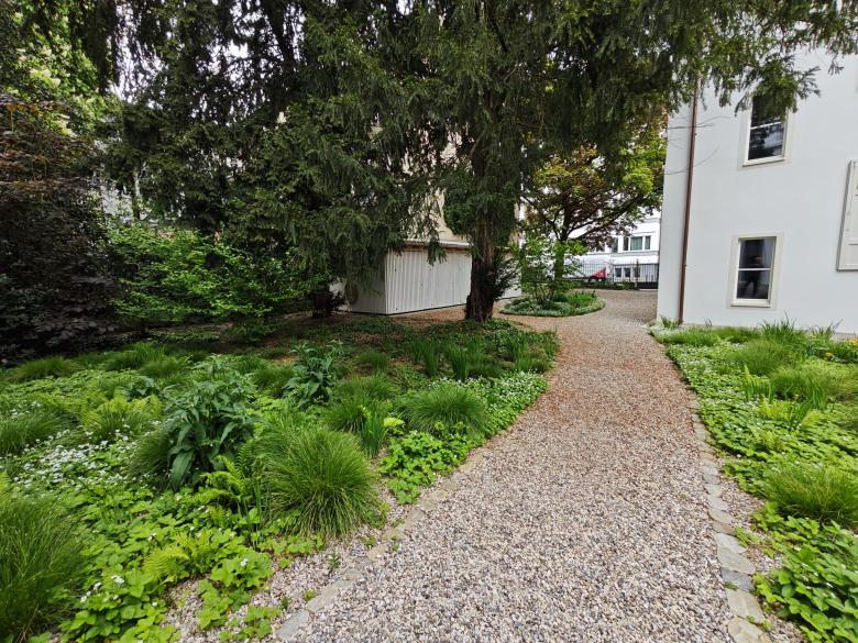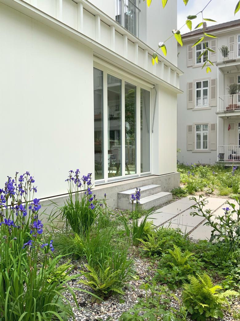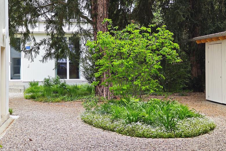 Mit dem Gebäudeensemble und der waldartigen Umgebung entsteht eine ruhige Oase in einem lauten Quartier. Grossflächig umgibt der grüne Staudenteppich mit kontrastreichen Blattformen den Neubau. Kaum wahrnehmbare Sickermulden fassen das Dachwasser der drei Bauten und sorgen mit dem schnell wechselnden Licht- und Schattenspiel der vorhandenen Bäume und Bauten für differenzierte Lebensbereiche im Staudenteppich. Zur Strasse hin, hinter dem gusseisernen alten Zugangstor, sorgt der helle Kiesbelag für eine klare und offene Eingangssituation.