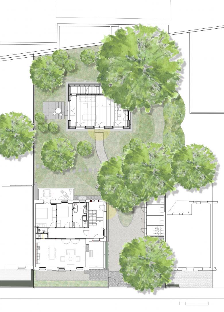 Im grünen Hinterhof mit alten geschützten Bäumen steht ein Neubau, mitten in der Parzelle, nahe unter einer alten Silberlinde. Mit dem sanierten historischen Altbau und einem neuen Fahrrad- und Geräteschopf bildet er ein stimmiges Ganzes in einem stark belebten Stadtquartier.