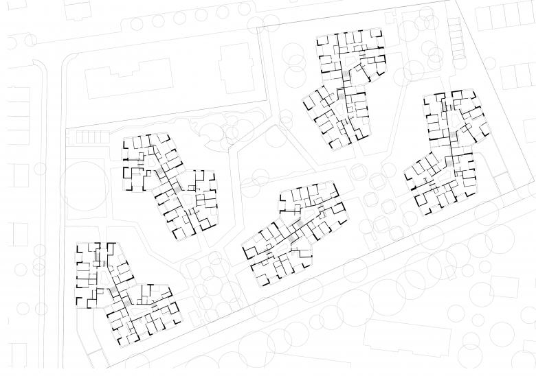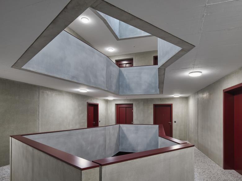 Die Häuser sind januskopfartig aus zwei ineinandergeschobenen Hausteilen komponiert, wobei sich die Gebäudeköpfe jeweils parallel bzw. orthogonal auf die Strassen beziehen und die sich jeweils gegenüberstehende Fassaden die Eingangsräume zum Areal fassen. Diese Orte sind in ihrer Funktion mit Foyers vergleichbar: sie bilden die Schnittstellen zur Öffentlichkeit, Ankunfts- und Aufenthaltsorte für alle Bewohner und prägen die Identität der jeweiligen Wohnadresse und den Strassenräumen.