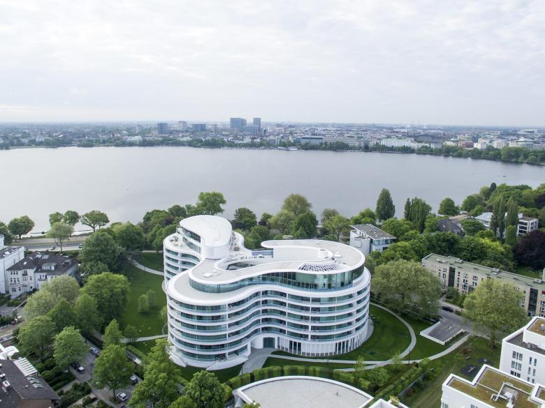 Ganz im Sinne von hanseatischem Understatement verbindet das Luxushotel „The Fontenay“ im Hamburger Stadtteil Rotherbaum, direkt an der Binnen-Alster, stilvolle Eleganz mit einer überraschenden Gebäudeform. Die Architekten von Störmer Murphy and Partners kreierten einen besonderen Grundriss bestehend aus drei verschliffenen Kreisen und erschufen so eine amorphe Figur, die sich sanft in die umliegende Parklandschaft einfügt. Je nach Blickwinkel erinnert die konkav bzw. konvex geschwungene Fassade an leichte Wellen, die strahlend weißen Keramikelemente hingegen an eine exklusive Luxusjacht.