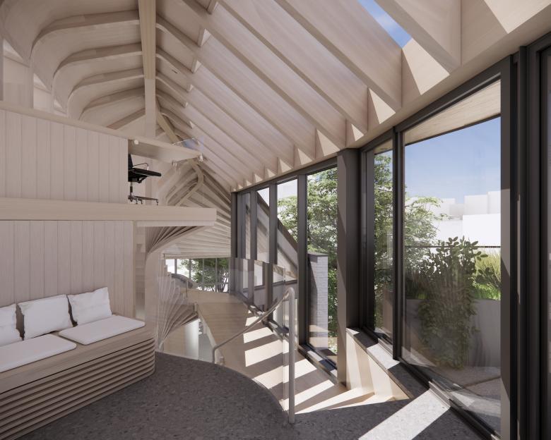 Employing a parametric and holistic design approach, the new mass timber architecture seamlessly integrates with the existing structure. Inserted in the center of the house is a spiral stair, which symbolizes a tree growing through the space and culminating in a wide-branching roof canopy.